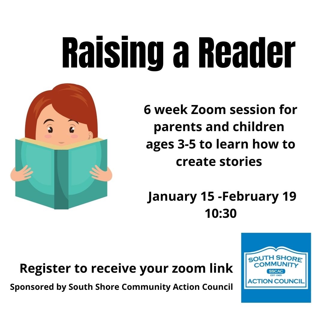 Raising a Reader with Big Ryan Fridays at 10:30 AM February 5 - February 19 Online Participation with Zoom Raising a Reader with Big Ryan, a six-week Zoom virtual story experience for ages 3-5! Fill out the form below and you will receive a Zoom link for attendance. This program is provided by the South Shore Community Action Council, CFCE.