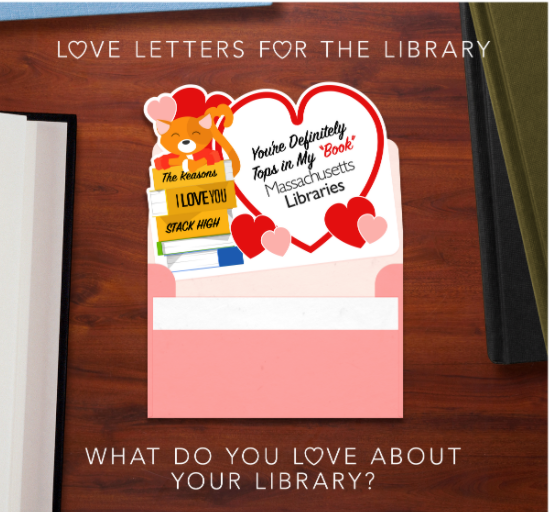 SHOW YOUR LIBRARY SOME LOVE. WRITE A SWEET VALENTINE TODAY! In recognition of Valentine’s Day, residents from across the Commonwealth have come together to show libraries some love! Join us in the MBLC’s #LibraryLovers Campaign and upload your digital valentine by clicking here. Your Valentine will help raise awareness about the value of libraries with local and state officials.