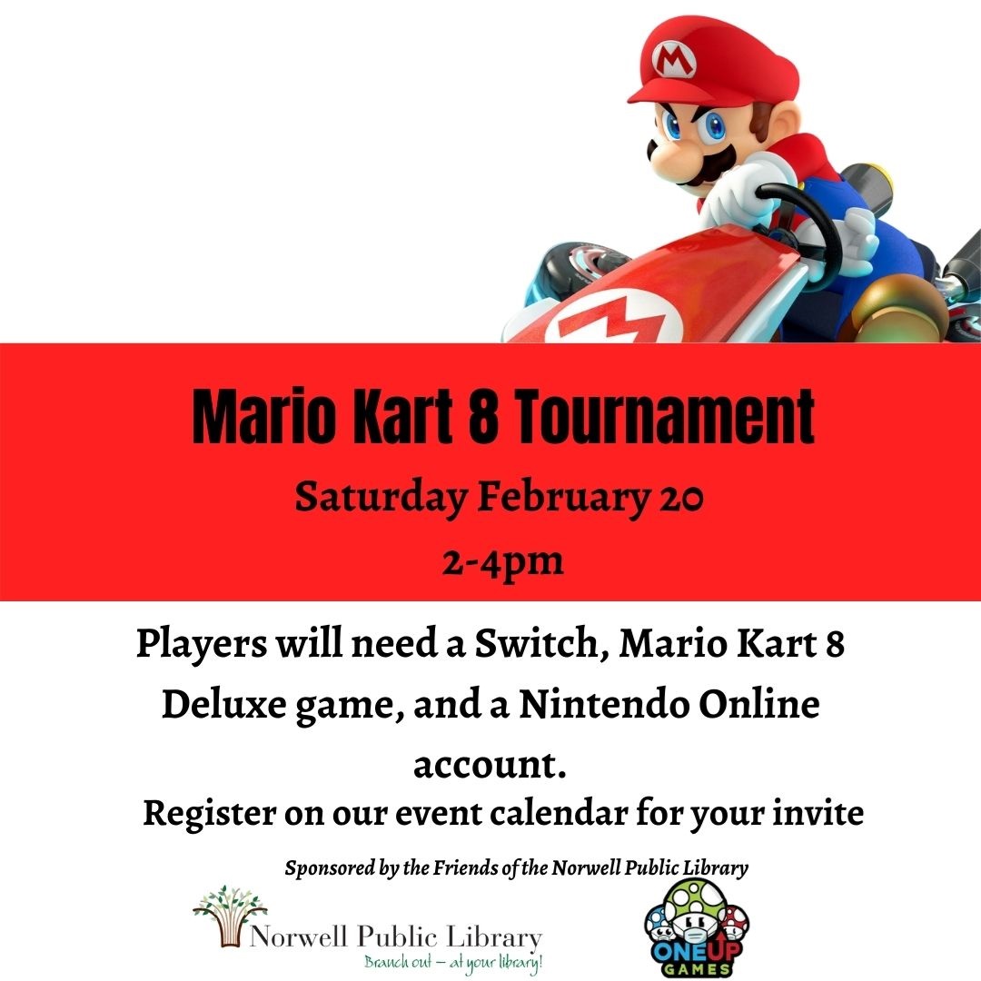 One Up Games Presents: Mario Kart 8 Tournament Saturday, February 20, 2021 2:00 PM to 4:00 PM *Participants must have their own Nintendo Switch, Nintendo Online, and a copy of Mario Kart 8 deluxe. Registration required, click here. Visit the library website for instructions on how to participate!