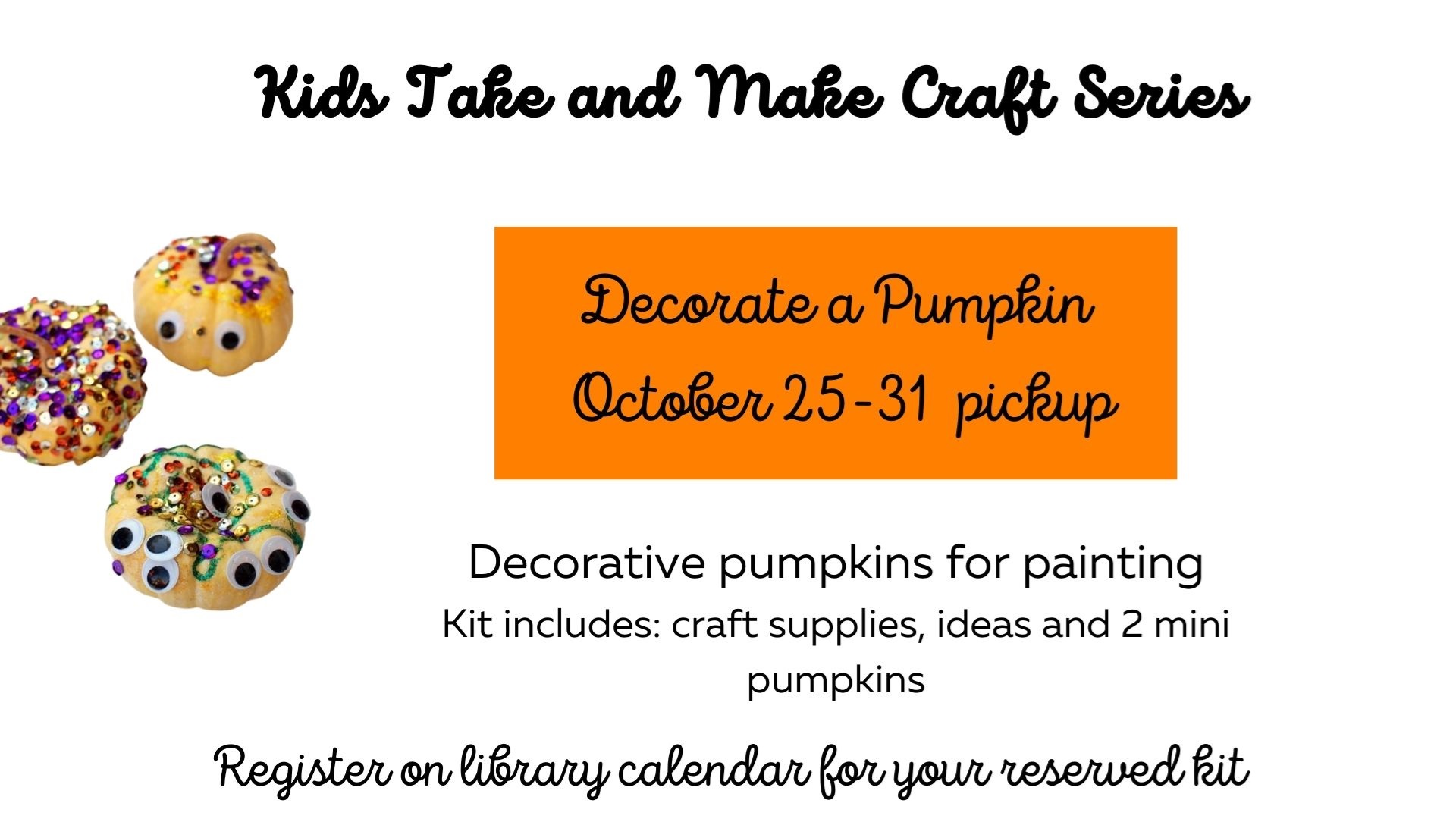 Take and Make: Decorate a Pumpkin Pickup Monday October 25- Sunday October 31 during library hours Children's Room Bring home a decorative pumpkin with ideas and supplies to create your very own creature. Registration is required beginning October 11 to reserve your kit, click here. Funded by the Friends of the Norwell Public Library