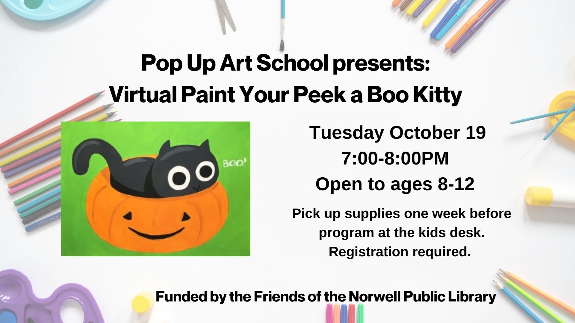 Pop Up Art School presents: Virtual Paint your Own Peek a Boo Kitty Pumpkin Tuesday, October 19 7 - 8:00pm Zoom All supplies are included and can be picked up a week before class. Open to ages 8-12. Registration is required to reserve your kit and Zoom link beginning October 5, click here. Funded by the Friends of the Norwell Public Library