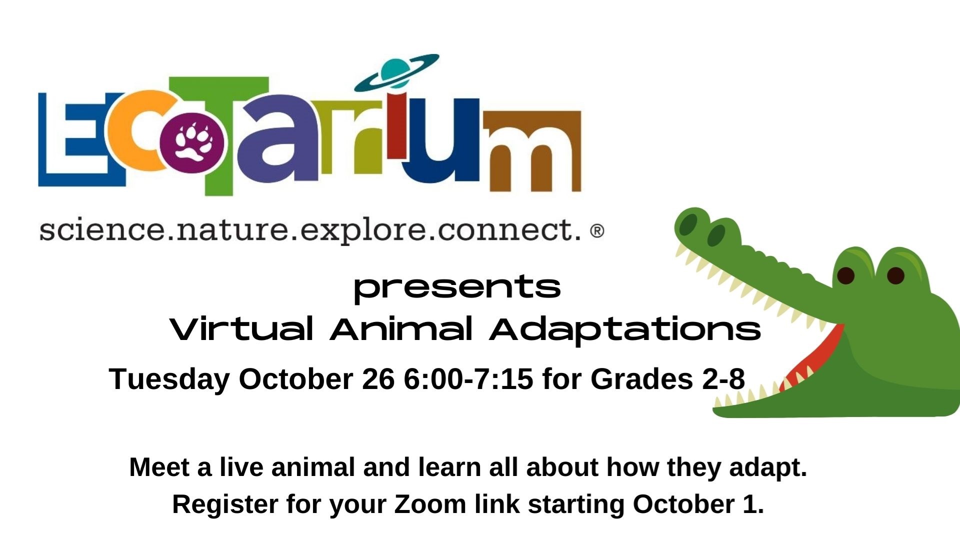 Registration is required starting October 1 to receive your Zoom link, click here. A raffle for a 4 pack of tickets to the Ecotarium will be open to all registrants.