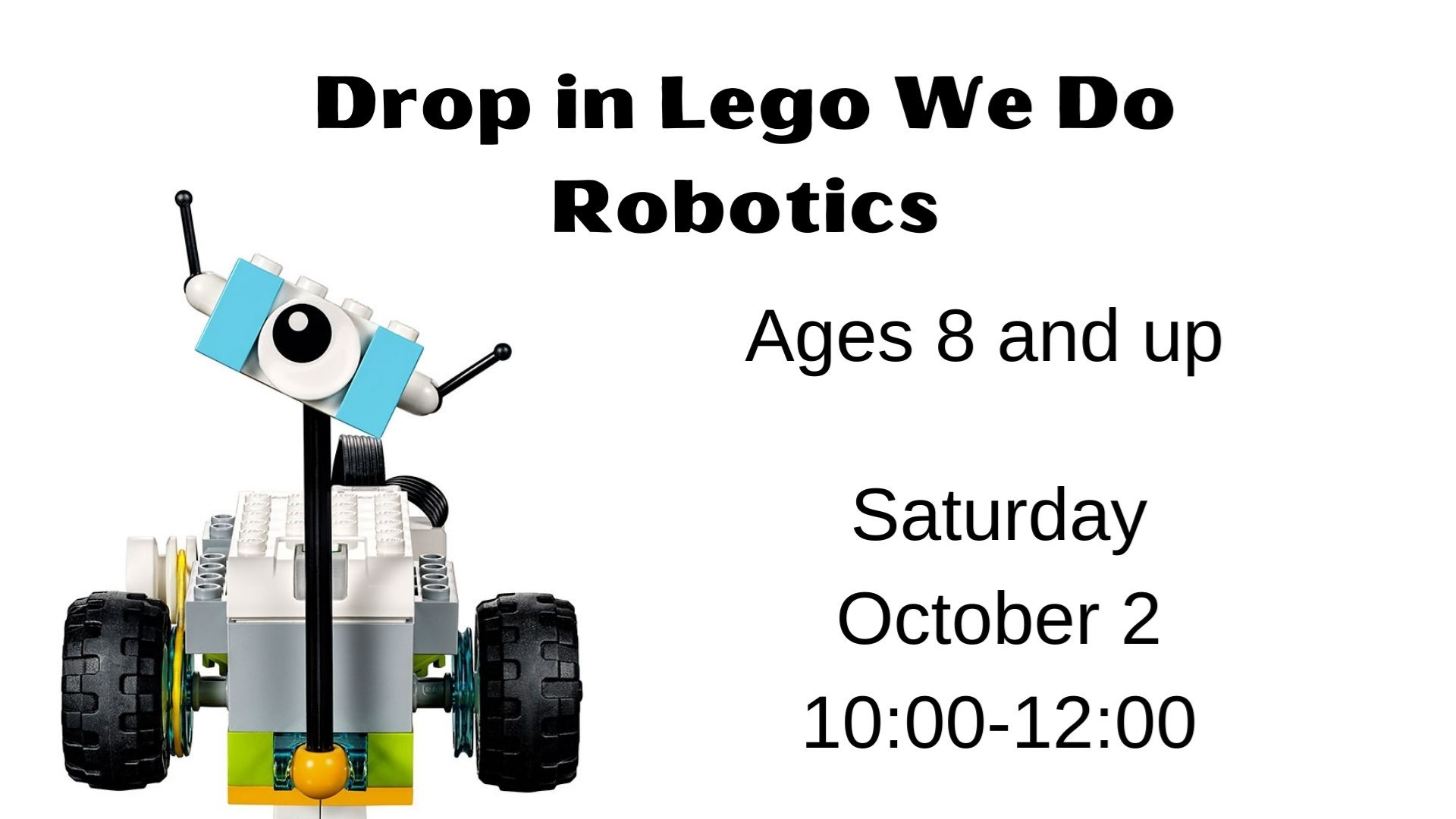 Drop in Lego WeDo Robotics Saturday, October 2 10:00am-12:00pm Children's Room Ages 8 and up can try a project with our Lego WeDo kits. No experience necessary. No registration required. First come, first served.