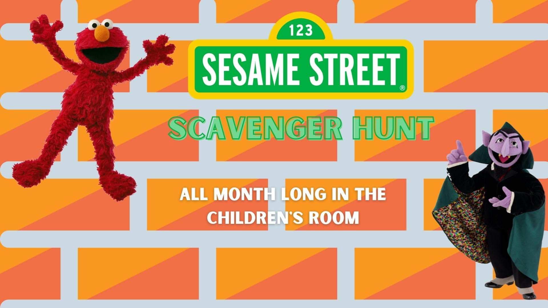 Sesame Street Scavenger Hunt All month long Children's Room Find characters hidden all around the children's room. No registration required.