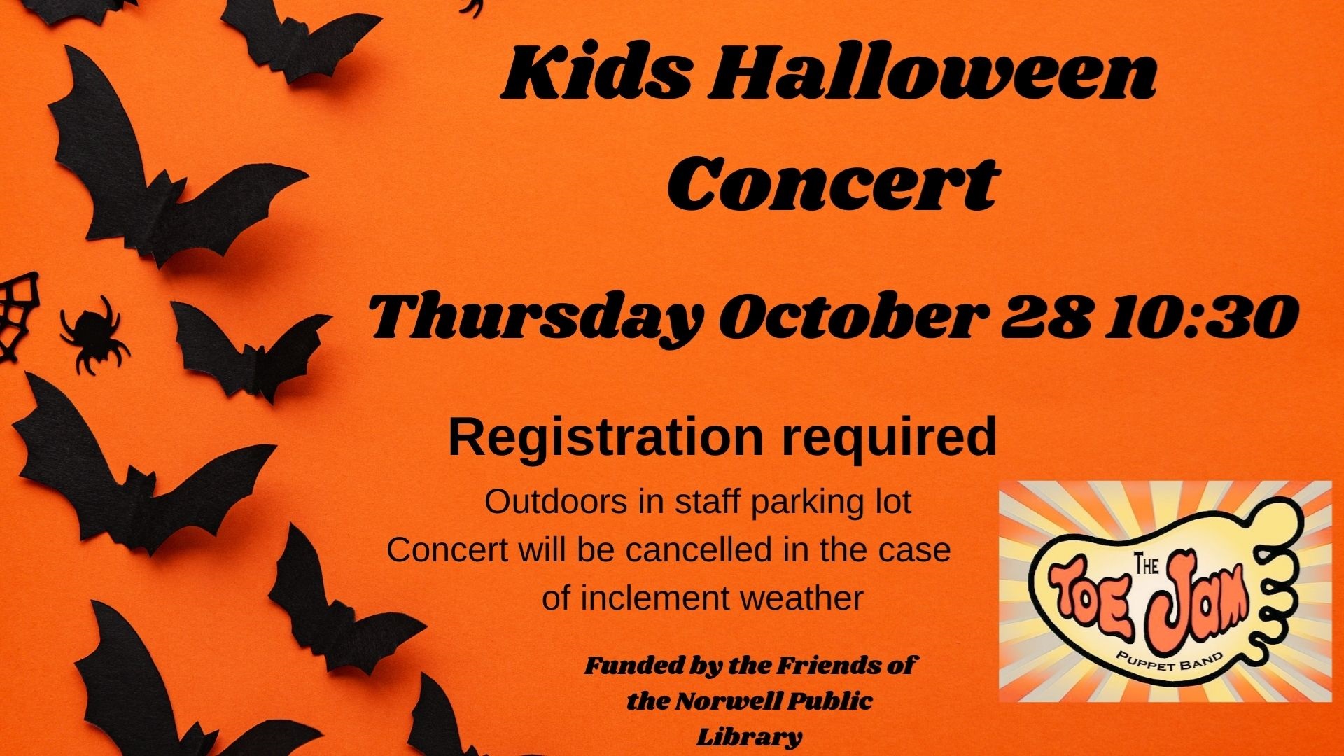 Toe Jam Puppet Band Halloween Show Thursday, October 28 10:30-11am Staff parking lot Toe Jam Puppet Band is coming for a special holiday all ages show outdoors. *We are hosting this OUTDOORS. Please bring your own blanket or chair.* Registration is required and begins on October 14, click here. Funded by the Friends of the Norwell Public Library