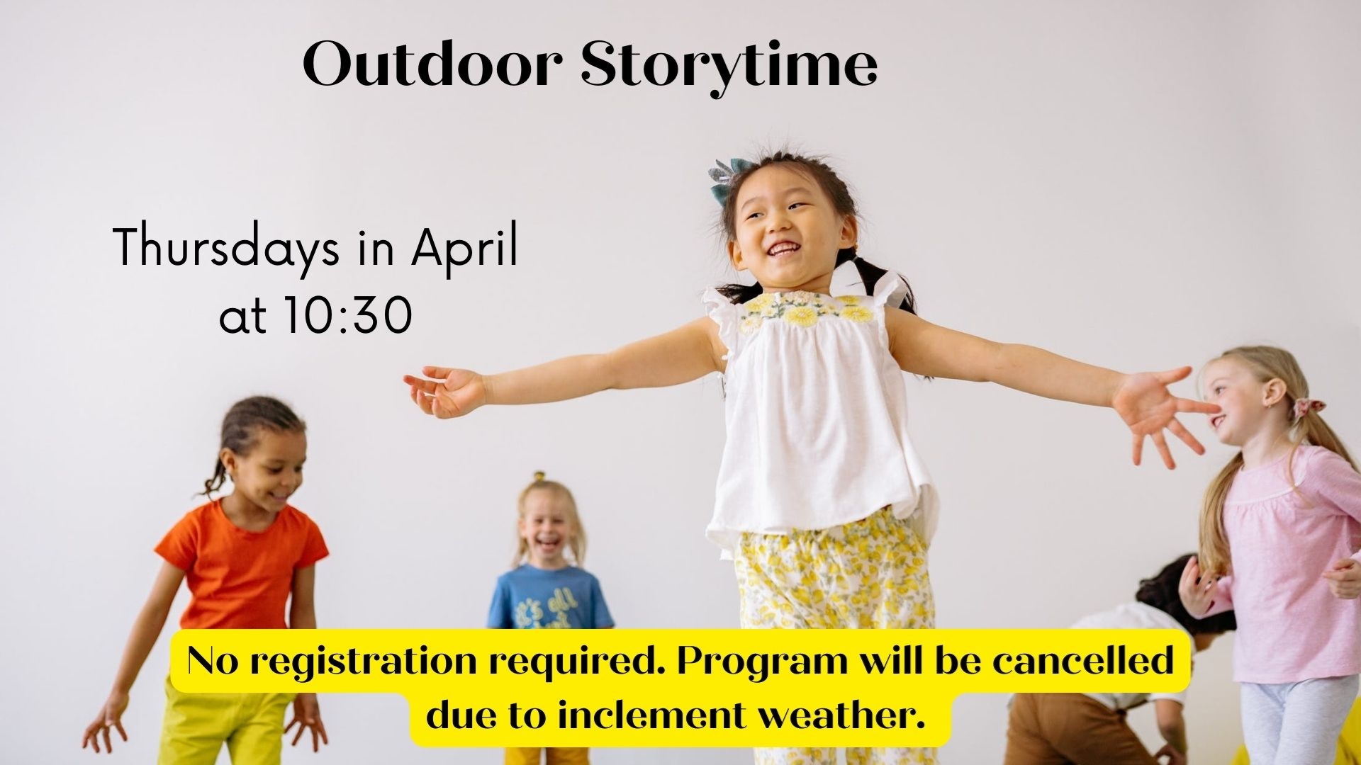 Outdoor Storytime Thursdays 10:30-11:00am Staff Parking Lot No registration required. In the case of inclement weather, the program will be cancelled. Please bring a chair or blanket.