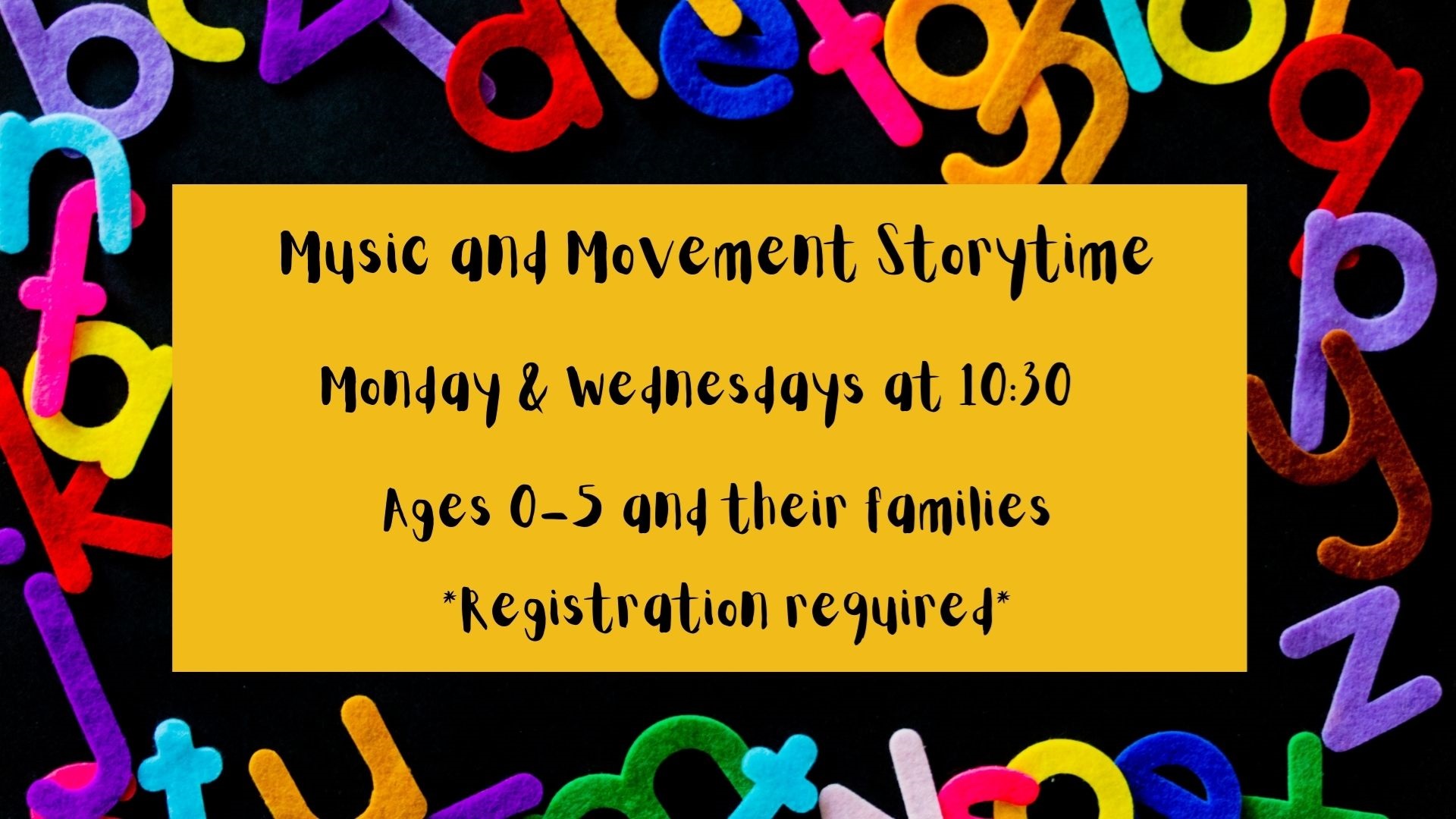 Music & Movement with Jessica Mondays & Wednesdays 10:30-11:00am All ages Meeting Room Ages 0-5 are welcome to join Jessica for 30 minutes of participatory songs and fingerplays that support early literacy and get your body moving. For the safety of all participants, registration is required and will be limited. Please sign up for each week you are interested in attending.