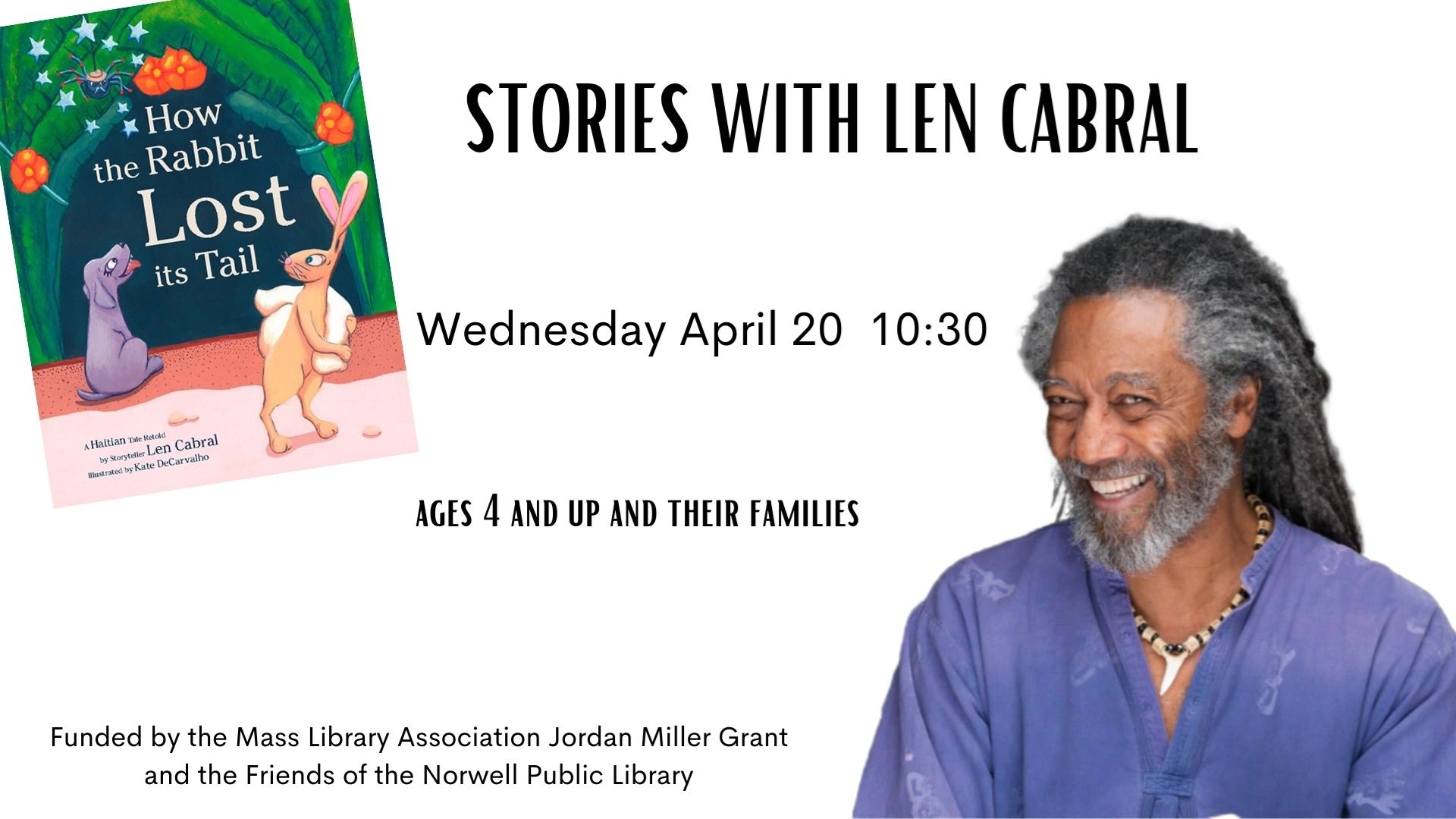 Stories with Len Cabral Wednesday April 20 10:30am Meeting Room Local storyteller and author Len Cabral will be sharing stories and providing tips on how to tell your own for ages 6 and up with a caregiver. This program was co-funded by the MLA Jordan Miller Grant and the Friends of the Norwell Public Library.