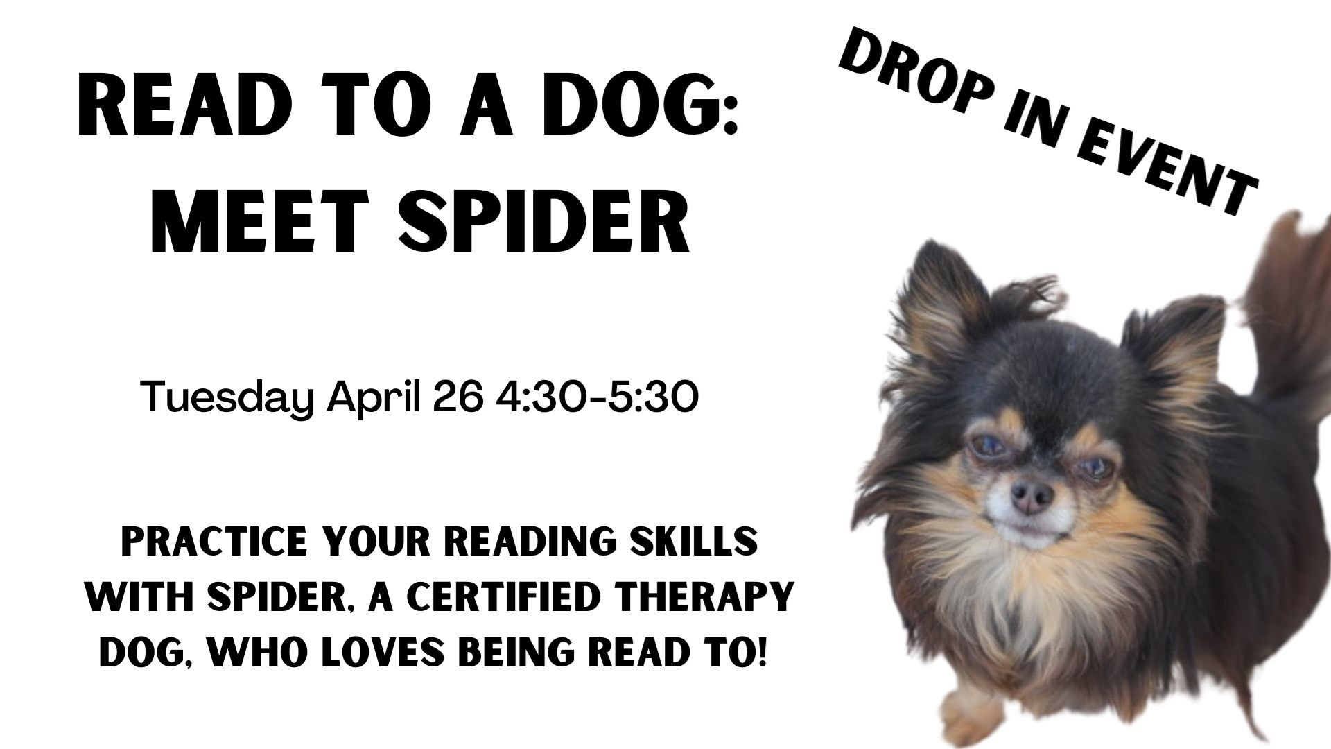 Read to a Dog: Spider Tuesday April 26 4:30-5:30pm Children's Studio Spider, a certified therapy dog, is back! Practice reading comprehension in a stress free environment. No registration required.