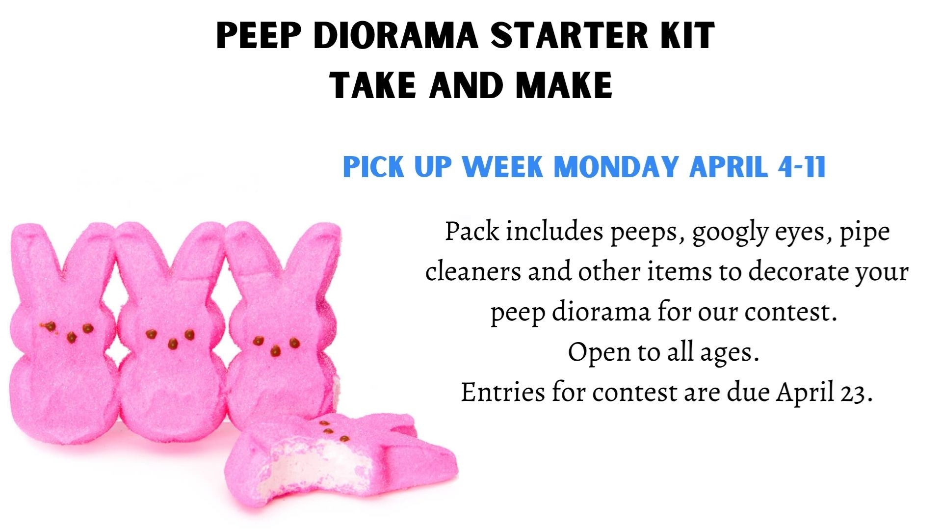 Take and Make Craft: Peep Diorama Starter Kit Pick Up Week April 4-11 Children's Room Kit includes Peeps, googly eyes, pipe cleaners and other ideas to help inspire you to enter our peep diorama contest.
