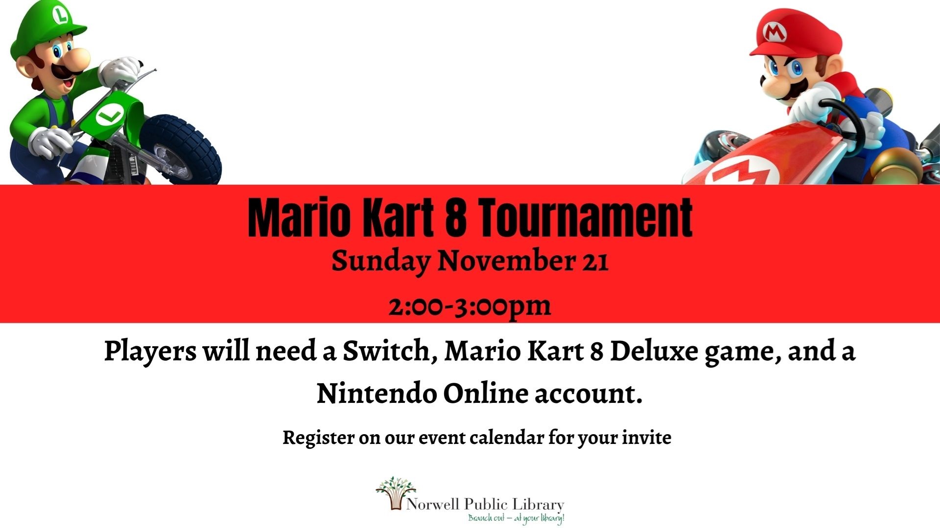 Mario Kart Deluxe 8 Tournament Sunday November 21 2:00pm-3:00pm Nintendo Online The library is hosting a Mario Kart 8 Deluxe Tournament for the Nintendo Switch. You can join us online for the event. You will need a copy of the game and a Nintendo Online account to play. Registration is required to receive your tournament link. The Winner receives a $15 GameStop gift card funded by the Friends of the Norwell Public Library. Registration is required starting Nov. 1 to receive your invite, Click here.
