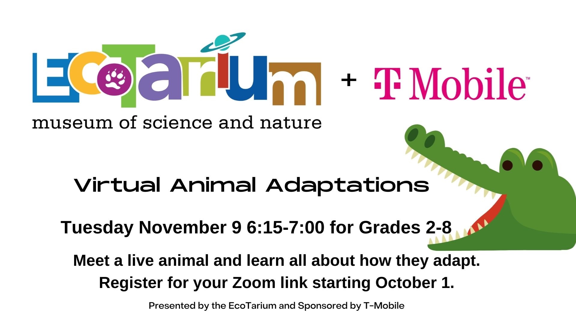 EcoTarium presents: Virtual Animal Adaptations RESCHEDULED: Tuesday, November 9, 6:15pm Zoom What structures and behaviors do animals exhibit that help them survive? Examine biofacts like pelts, skulls, and shells to conclude how form and function influence evolutionary success. Then meet a live animal to see adaptations up close. Ideal for elementary age students in grades 2-8. A raffle for a 4 pack of family tickets to the Ecotarium will be open to all registrants. This event is presented by the EcoTarium and Sponsored by T-Mobile. Registration is required to receive your Zoom link, click here.