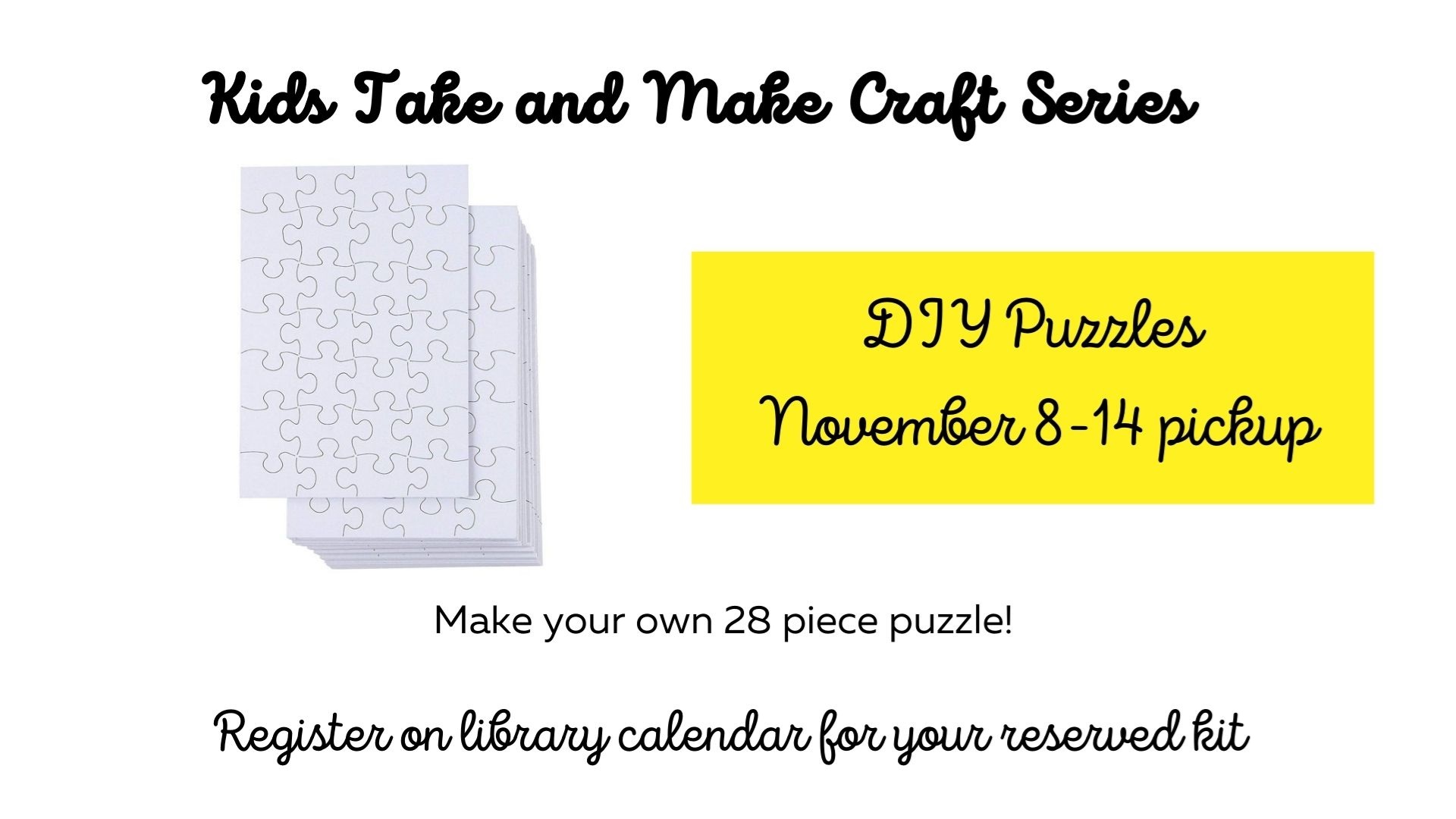 Take and Make: DIY Puzzles Pickup Monday November 8- Sunday November 14 during library hours Children's Room Bring home a 28 piece blank puzzle to decorate. Registration is required beginning Nov 1 to reserve your kit, click here. Funded by the Friends of the Norwell Public Library