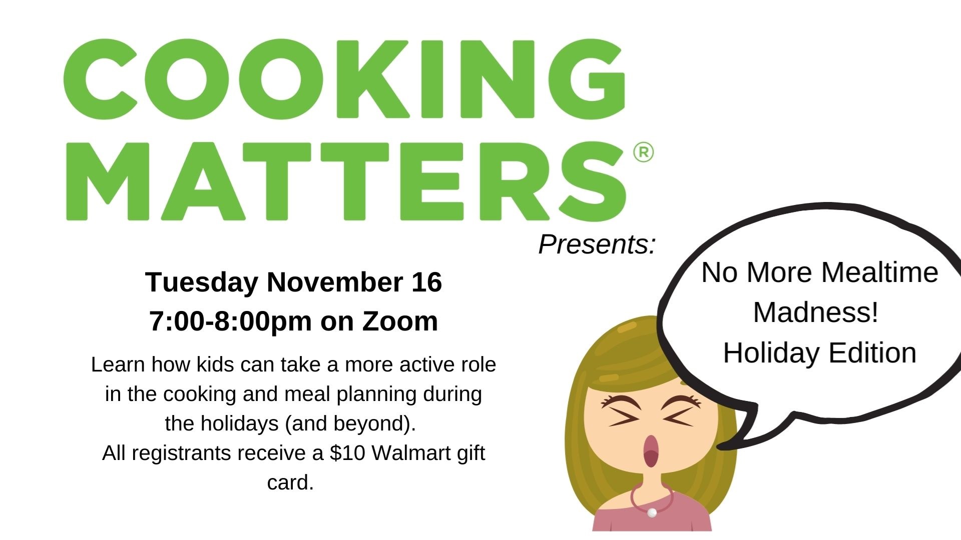 Cooking Matters presents: No More Mealtime Madness Holiday Edition Tuesday, November 16 7 - 8:00pm Zoom This session will demonstrate a fun recipe for you and your kids to watch and try later at home. Cooking matters will introduce how to maintain a basic pantry, discuss ways to involve kids in meal planning to create more buy-in, and come up with ideas for balancing good parenting with healthy eating. Then show how to use all these skills to make the most of holiday meals! Join us on any device with an internet connection! Kids are welcome! All participants will receive a $10 Walmart e-gift card. Registration is required to receive your Zoom link beginning November 1, click here.