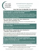 Live Well Age Well Educational Series TUESDAY, NOVEMBER 16 6:30—8:30 PM Meeting Room Norwell Public Library 64 South Street, Norwell, MA, 02061 “TOUGH CONVERSATIONS: CHOOSING YOUR CARE GOALS AND PLANNING FOR THE END-OF-LIFE” Whether you’ve received a difficult diagnosis or are experiencing natural decline, it’s important to think about and communicate your personal care goals and end-of-life wishes. Learn about care options and having those important conversations. To register, call the COA: 781-659-7878.