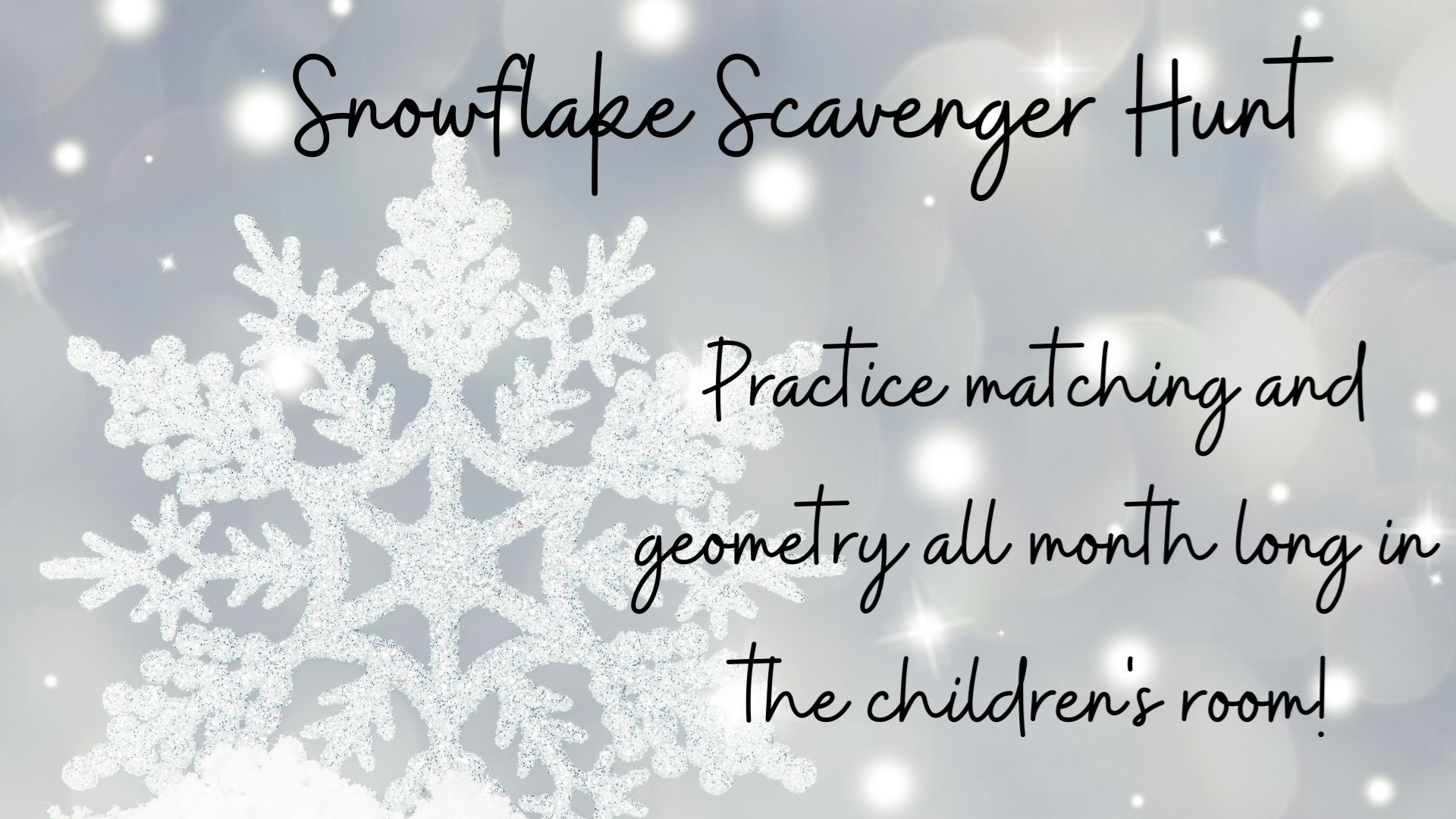 Snowflake Scavenger Hunt All month long Children's Room Learn all about matching and geometry while finding snowflakes hidden all around the children's room. No registration required.