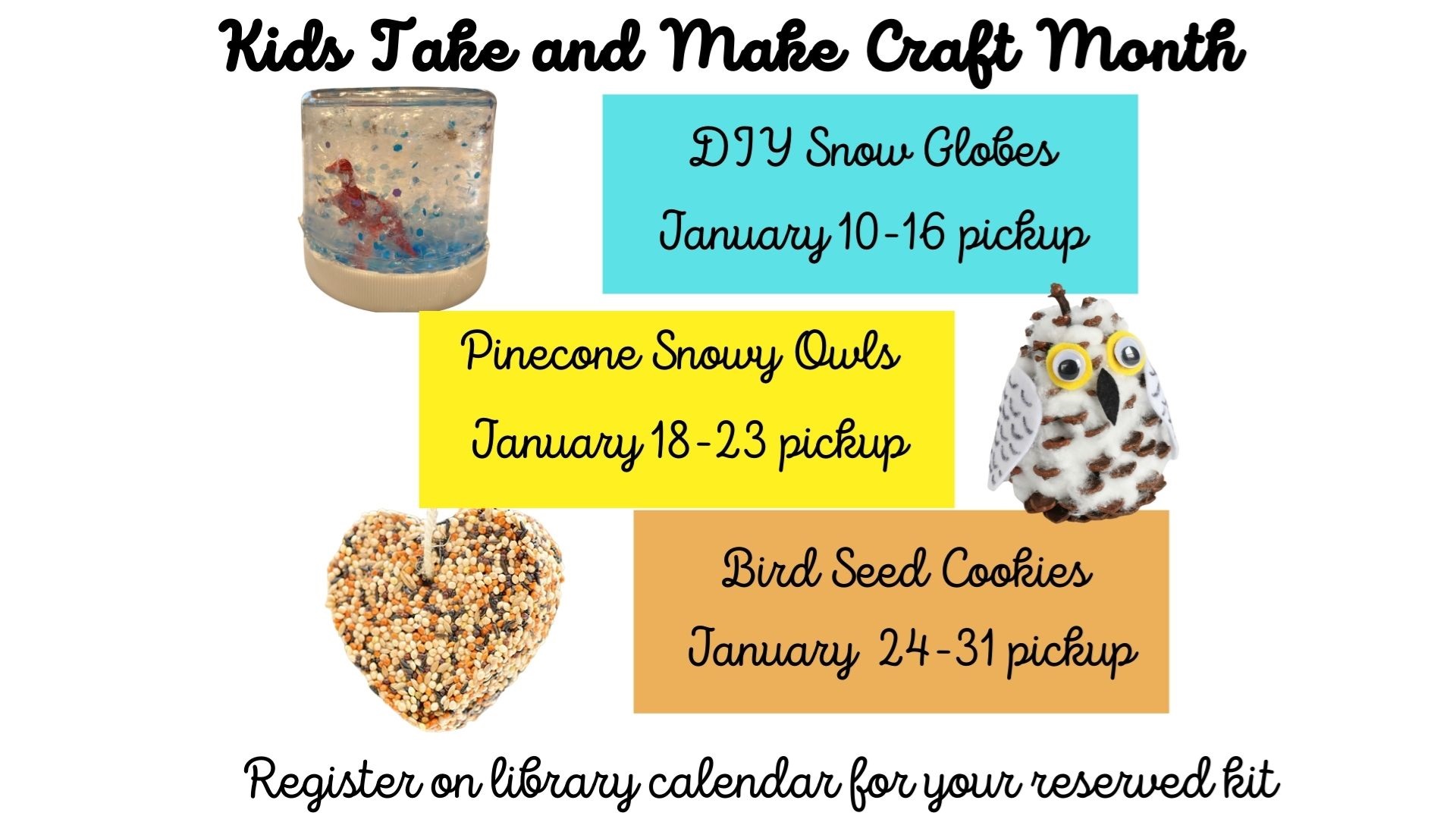 Take and Make Craft Month! DIY Snowglobes Pick Up Week January 10-16 Registration is required prior to picking up your kit. Pinecone Owls Pick Up Week January 18-23 Registration is required prior to picking up your kit. Birdseed Cookies Pick Up Week January 24-31 Registration is required prior to picking up your kit. Funded by the Friends of the Norwell Public Library