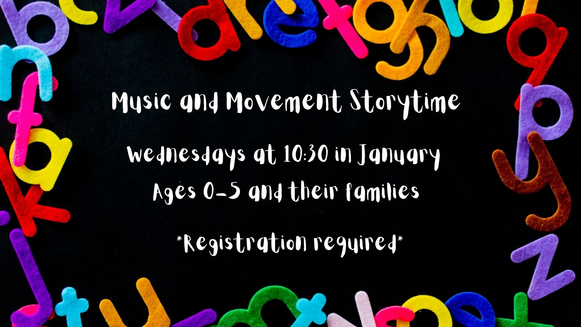 Music & Movement with Jessica Wednesdays beginning Jan 12 10:30-11 Meeting Room Stories, songs and movement for kids ages 0-5 and their caregivers. Registration is limited. Please register for each week of attendance.