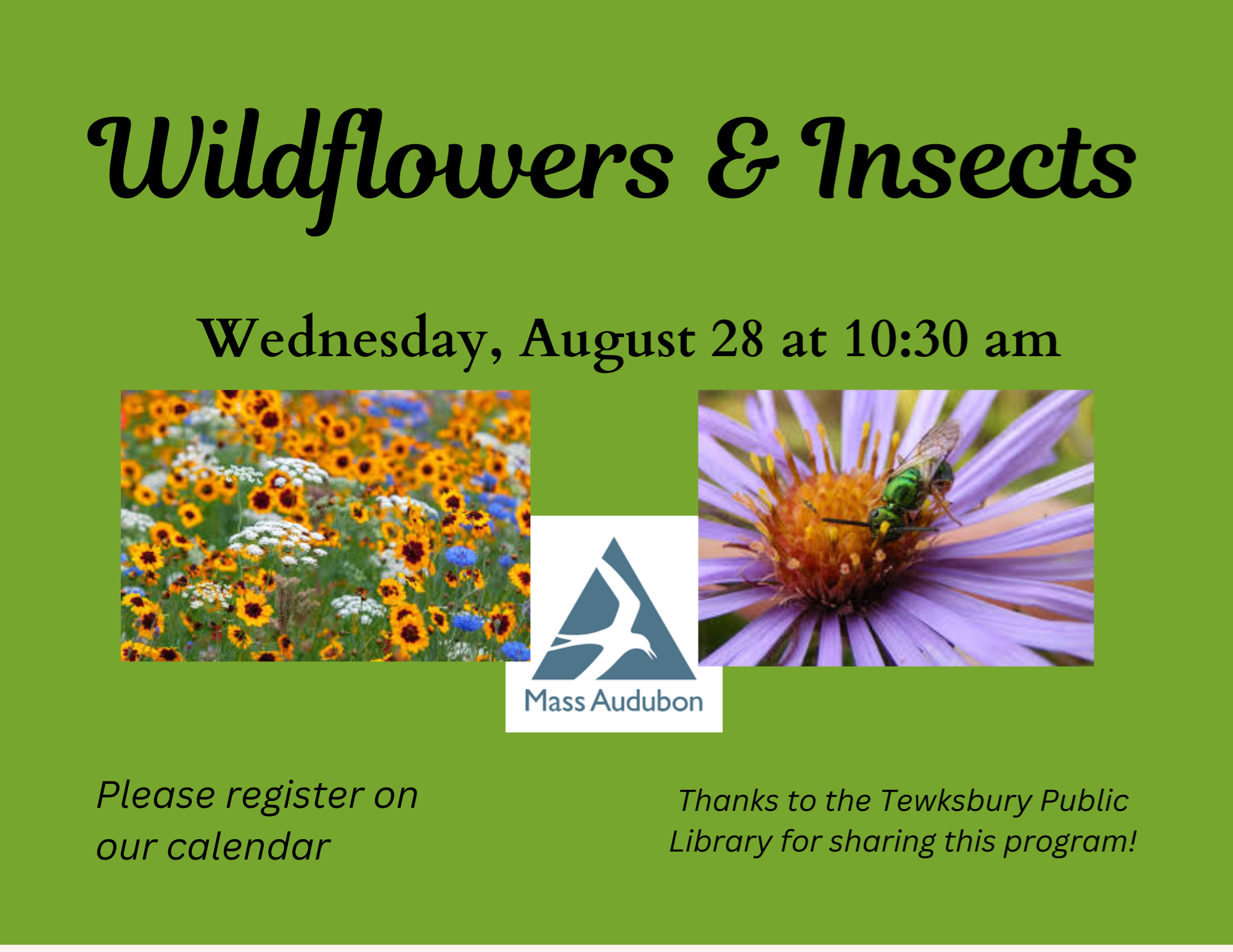 VIRTUAL: Wildflowers & Insects Wednesday, August 28 at 10:30 am The end of summer is very active with lots of wildflowers and insects about. From fields and field edges filled with milkweed, asters, and goldenrods to wetlands with carnivorous pitcher plants and cardinal flowers, each habitat has its own community of perennials and insects. Learn how these organisms interact and their importance in the ecosystems we live in. Led by Tia Pinney, a Biologist, Lead Naturalist, and educator at Mass Audubon’s Drumlin Farm Wildlife Sanctuary in Lincoln. Please register Thanks to the Friends of the Tewksbury Public Library for sharing this program!