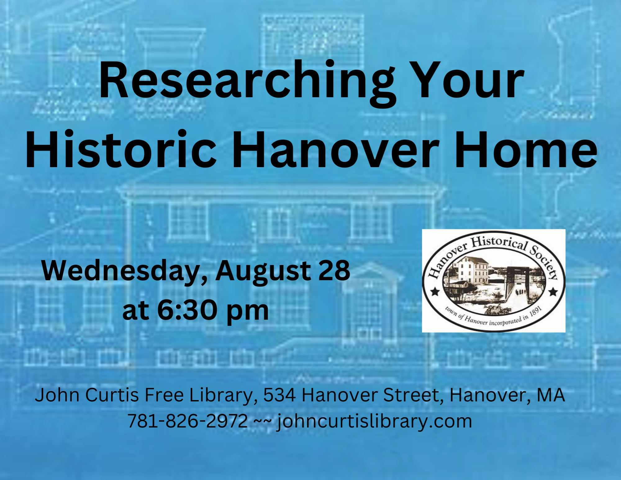 Researching Your Historic Hanover Home Wednesday, August 28 at 6:30 pm Ever wanted to learn more about your historic Hanover building? This one hour workshop will introduce people to the basics of researching a historic house or structure in Hanover. The workshop will start with a quick guide to architectural styles and examples from the 17th to the 20th Centuries. The workshop will also cover online resources such as the Plymouth County Registry of Deeds, online genealogical resources, the MACRIS database of cultural resources available from the Massachusetts Historical Commission, and other useful online sites for more information. No registration required.