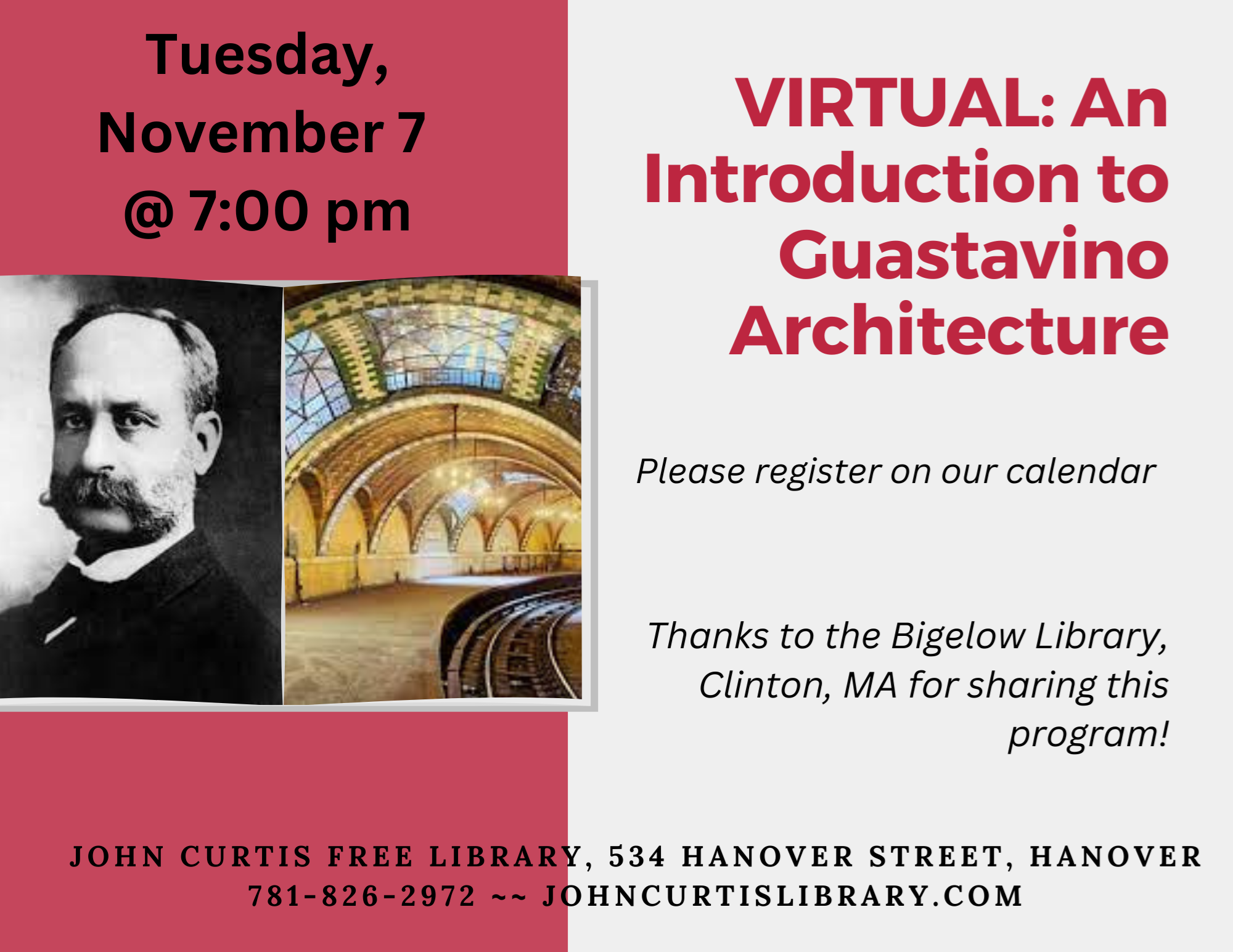 VIRTUAL: An Introduction to Guastavino Architecture Tuesday, November 7 @ 7:00 pm What do the following buildings have in common: Bigelow Library - Boston Public Library - Biltmore Estate (NC) - Cathedral of St. John the Divine - Carnegie Library at Mt. Vernon Square? They are built, at least partially, using the Guastavino Technique. Join Guastavino Alliance board member Rena Henderson to learn about this prolific architect and his Spanish building technique. For more information, check out the Guastavino Alliance. Thanks to the Clinton Public Library for sharing this program!
