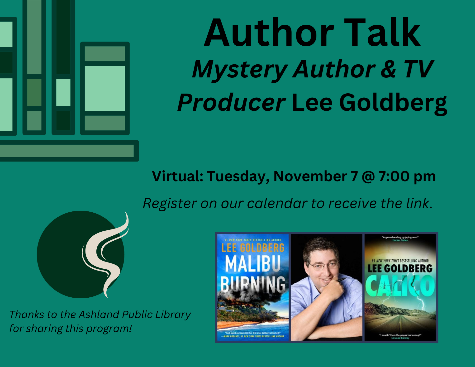 VIRTUAL: Author Talk with Lee Goldberg Tuesday, November 7 @ 7:00 pm Join us in conversation with Lee Goldberg and celebrate the release of "Calico" which comes out today! Lee not only writes wonderful mysteries, he's been the writer and producer of one of our favorite TV shows, "Monk", so you know that this will be a fascinating, quirky, and fun discussion. Thanks to the Ashland Public Library for sharing this program!