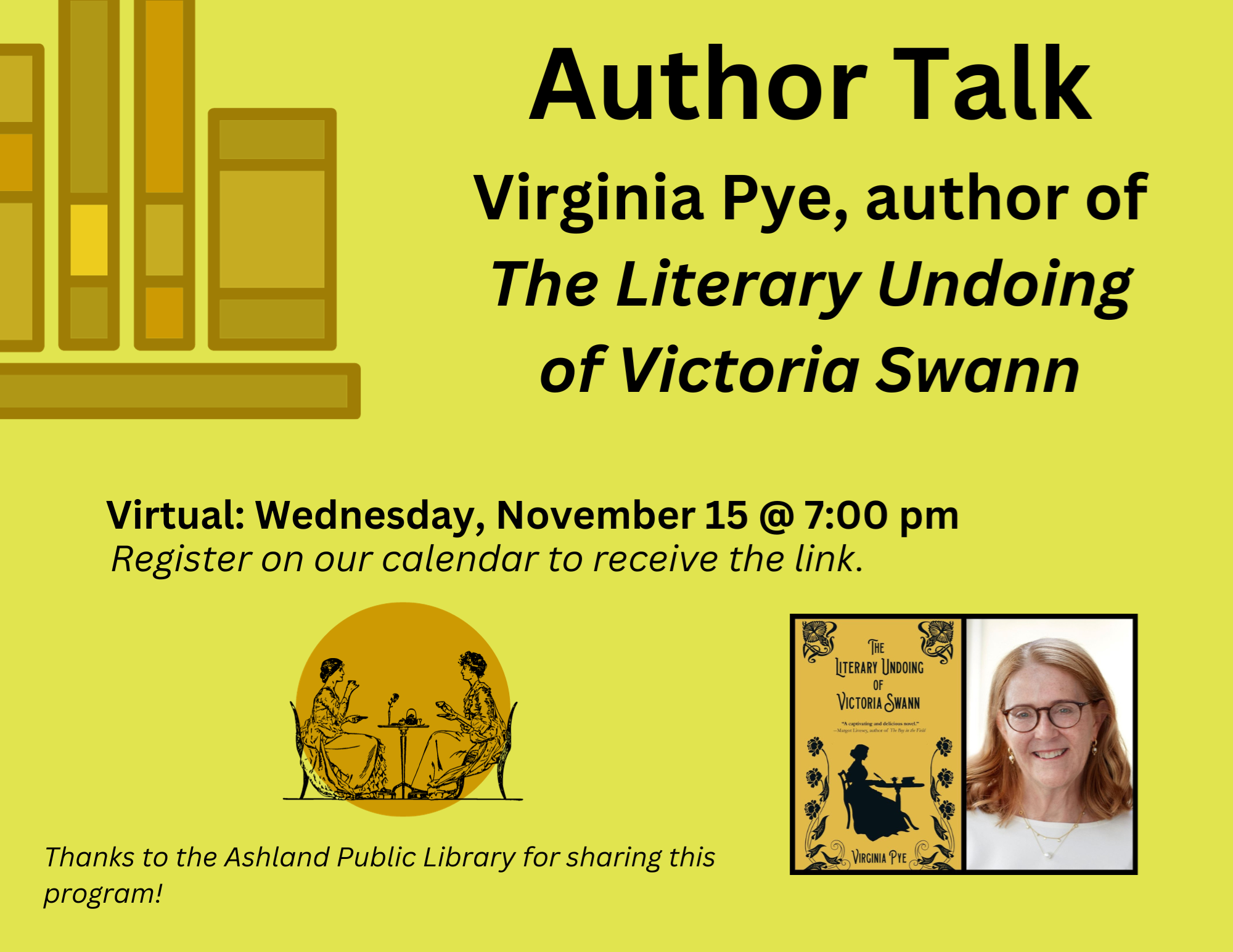 VIRTUAL: Author Talk with Virginia Pye, The Literary Undoing of Victoria Swann Wednesday, November 15 @ 7:00 pm This one's for those of you who love historical fiction set in Boston as well as books related to writing and stories of finding yourself! We're chatting with author Virginia Pye about her most recent book "The Literary Undoing of Victoria Swann". Bring your questions as this will be a rapid fire Q&A! Thanks to the Ashland Public Library for sharing this program!