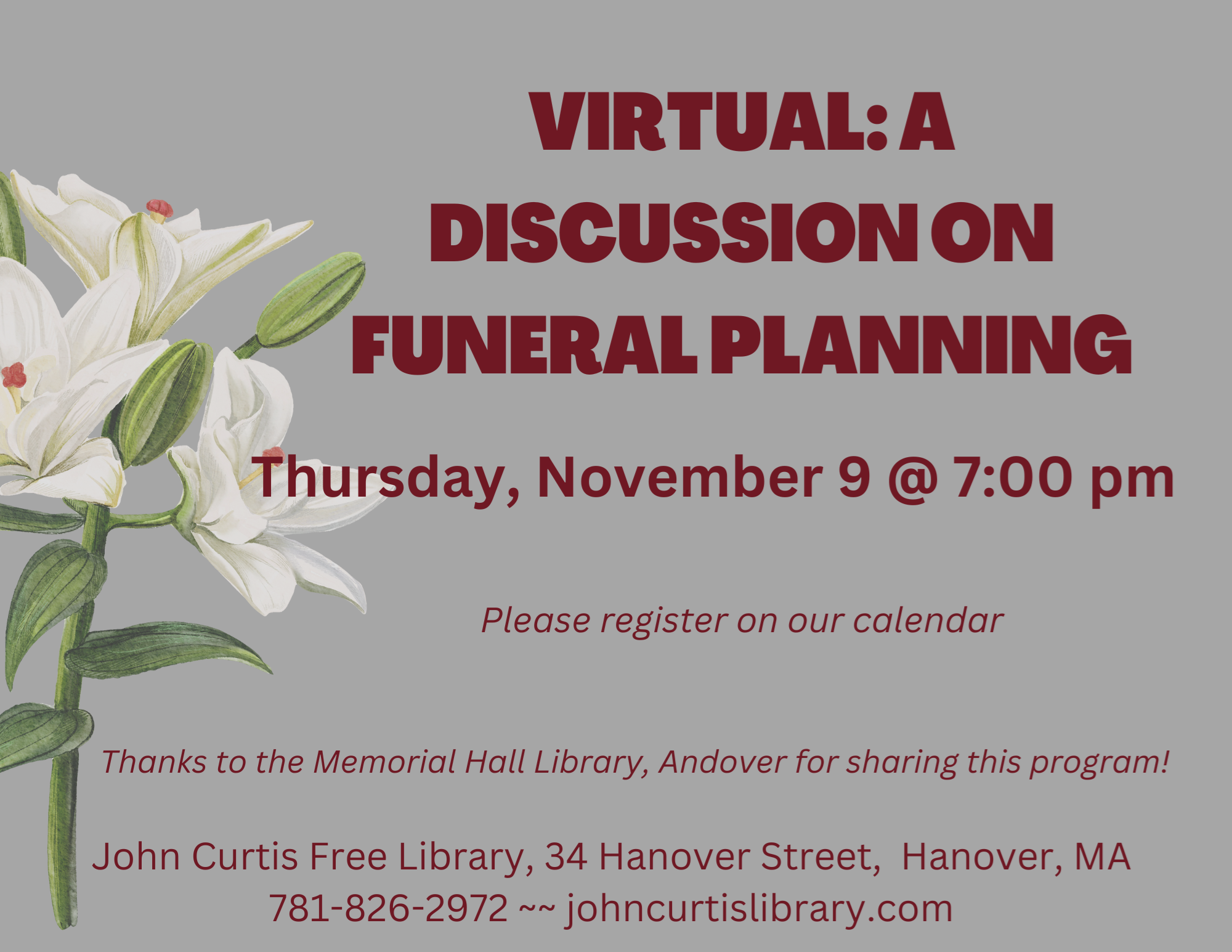 VIRTUAL: A Discussion on Funeral PlanningThursday, November 9 @ 7:00 pm Please join us for an in depth conversation and Q&A session with funeral director and former funeral home owner, Rick Dewhirst. We all plan for numerous events – weddings, anniversaries, vacations, the start of the school year, and more, but planning for funerals doesn’t often make that list. His goal and the purpose of this presentation is to help illuminate the many options and choices we all have and to ease the process and often difficult experience of providing ourselves and loved ones a meaningful, sensible, and cost effective funeral plan. Thanks to Memorial Hall Library in Andover, MA for sharing this program!