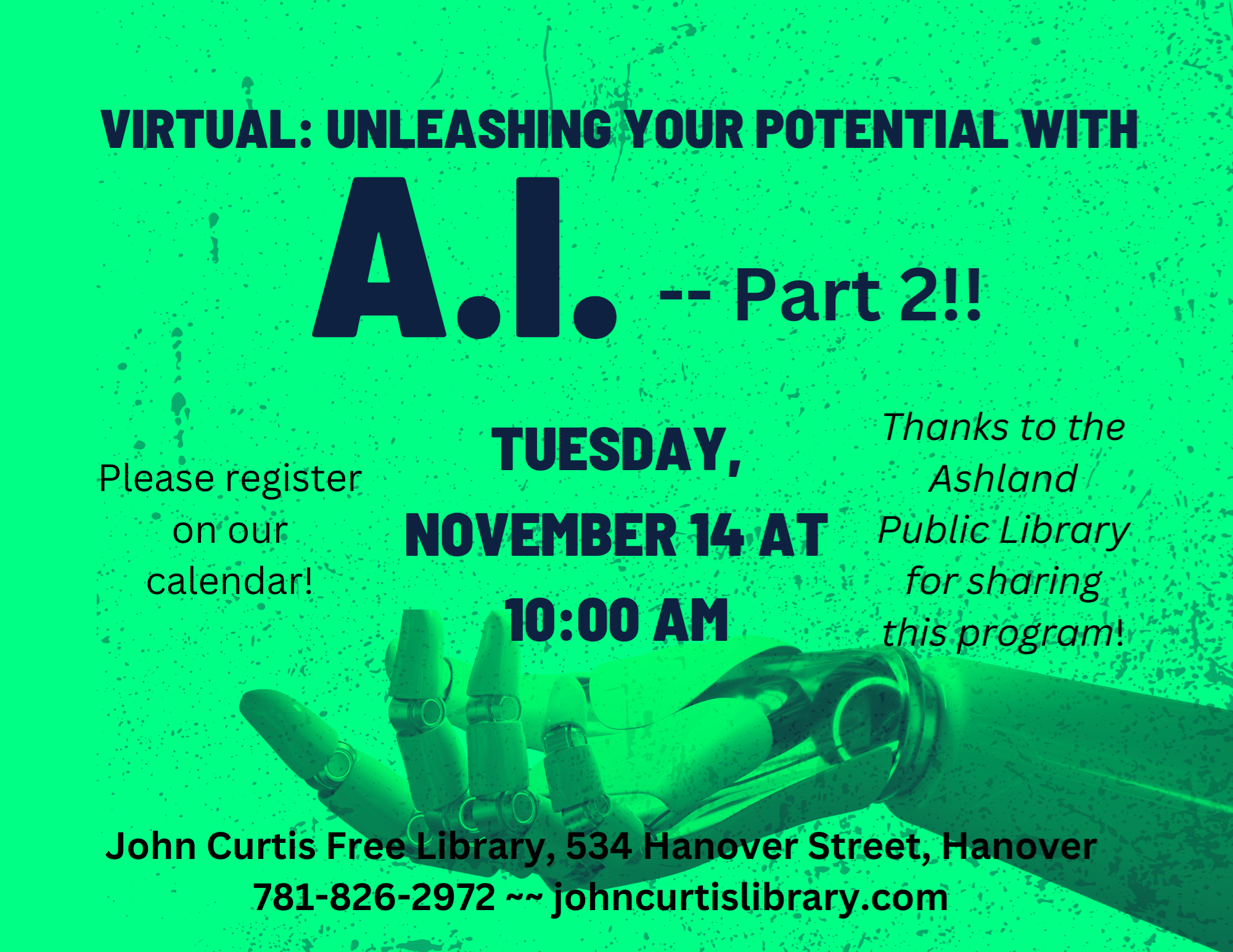 VIRTUAL: Unleashing Your Potential with A.I., Part 2! Tuesday, November 14 @ 10:00 am Our presenter had so many questions, she's back for part 2!! Do you have questions about how you can use Artificial Intelligence to maximize your resources and play with your creative juices? Then this workshop is for you! In this captivating workshop, participants will explore how AI technology and tools can supercharge their productivity, ignite their creativity, and elevate their overall well-being. This workshop is suitable for participants of all technology experience levels, from beginners to advanced. Thanks to the Ashland Public Library for sharing this program!