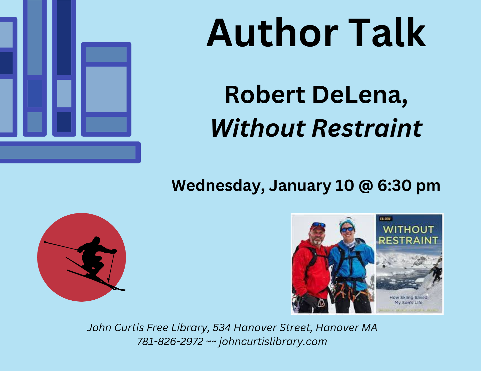 IN PERSON: Author Talk with Robert DeLena, Without Restraint Wednesday, January 10 @ 6:30 pm As a child Ryan DeLena had difficulty controlling his emotional outbursts. This led to placement in schools that relied on detrimental methods of behavior modification such as physical restraints. Nothing helped from a team of doctors to heavy medication. Then in 2010, Ryan was voluntarily committed to a mental hospital for further evaluation. Two years earlier, after an impulsive decision Rob had to take Ryan skiing, he discovered a different child than the version experts were so sure about. Rob began to question the path laid for his son by the professionals paid to judge him. He later convinced Mary Beth to fight the medical and educational complexes over Ryan’s care and school placement, and together they fostered the freedom Ryan needed to pursue his dream of becoming a professional ski mountaineer.