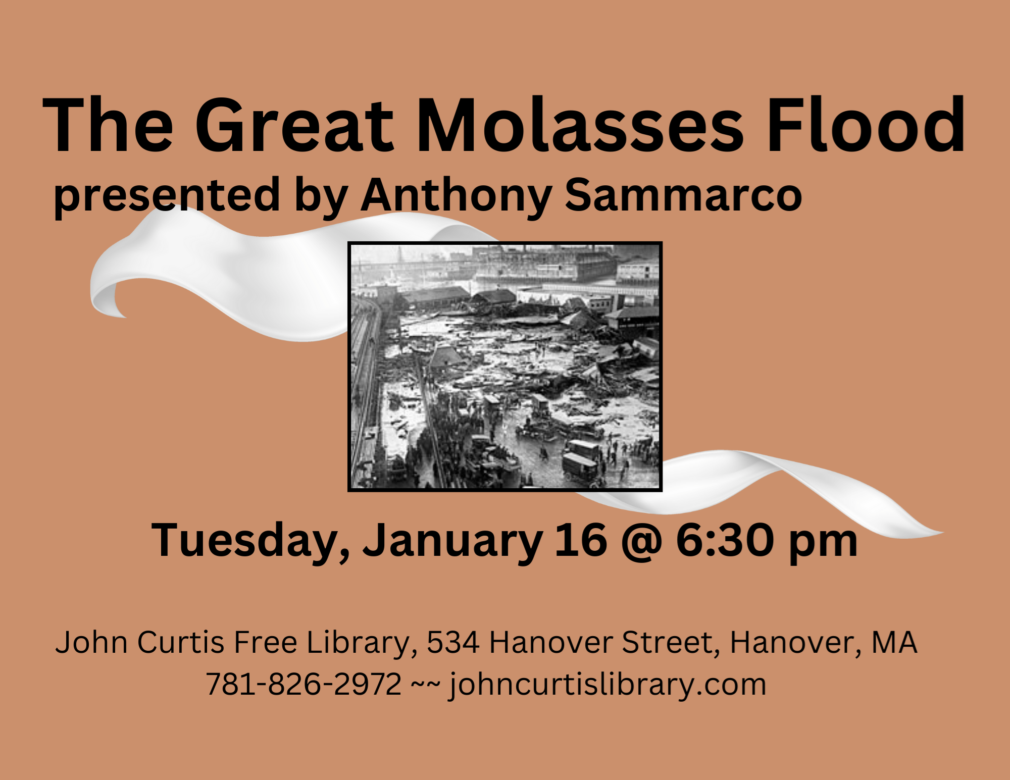IN PERSON: The Great Molasses Flood with Anthony Sammarco Tuesday, January 16 @ 6:30 pm Molasses has a rich history in the Caribbean where sugarcane is cultivated and was a popular sweetener throughout the United States in the early 20th century. Massachusetts has an integral connection as it was part of the Triangle Trade: Rum from New England was traded in Africa for slaves, which were brought to the West Indies and the Caribbean where they cultivated sugar cane. The sugar cane was later refined into molasses, which was shipped to New England and often used in the distillation of rum. This lecture will explore the Isaac Royall Family of Medford and the Lawrence Rum Distillery on Ship Avenue (now Riverside Avenue). In his lecture on “Molasses,” Anthony Sammarco traces it from the 18th century through the tea-totalism & abolitionist causes of the 19th century to the Great Molasses Flood of 1919, which became an integral part of the North End of Boston’s history.