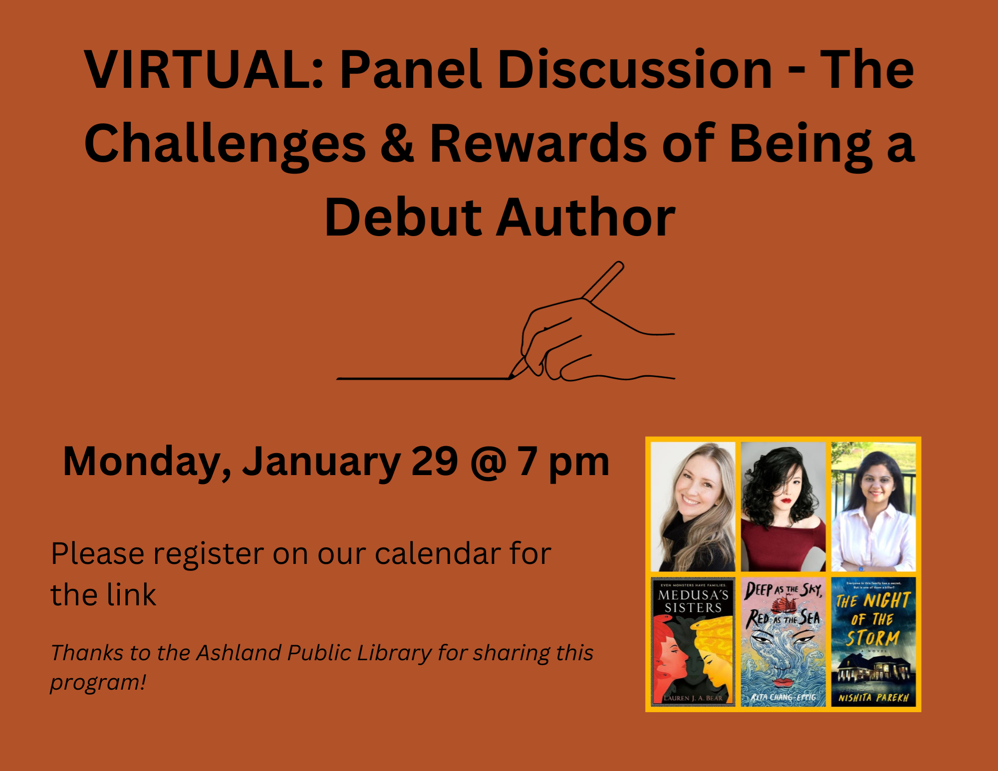 VIRTUAL: Panel Discussion - The Challenges & Rewards of Being a Debut Author Monday, January 29 @ 7:00 pm We welcome authors Lauren J. A. Bear, Rita Chang-Eppig, and Nishita Parekh to our virtual stage. We'll be talking all about getting into publishing, the pitfalls, challenges, and roadblocks as well as the excitement, fulfillment, and reader enthusiasm that makes it all worthwhile. Bring your questions as this will be in a Q&A format. Thanks to the Ashland Public Library for sharing this program!