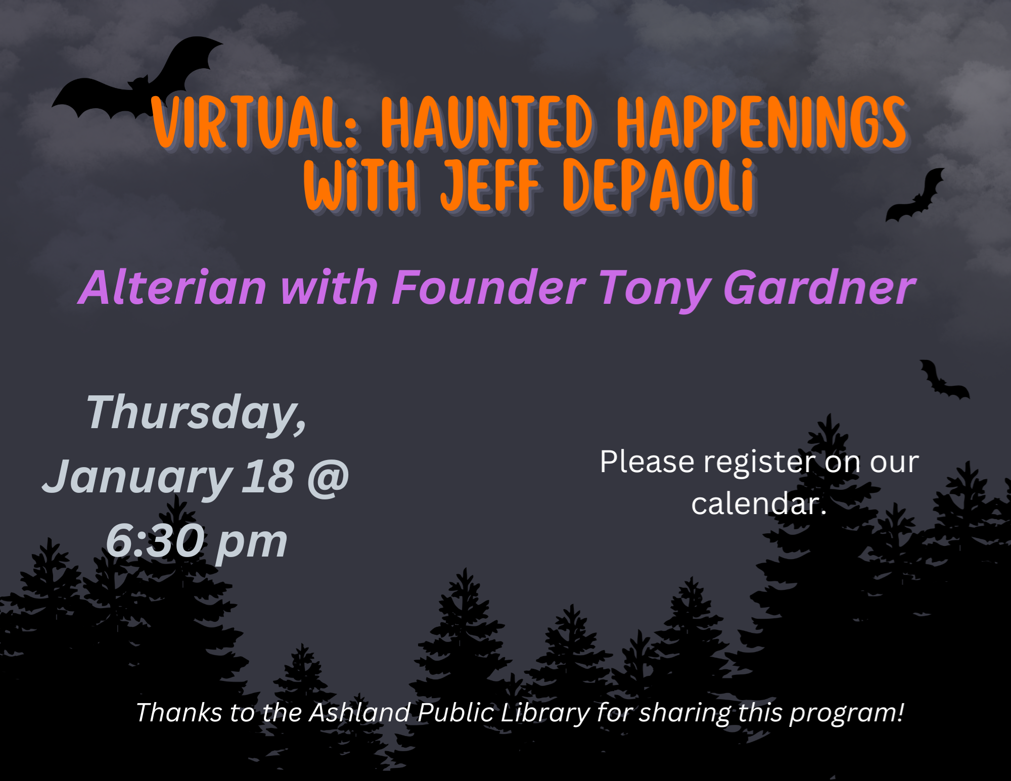 VIRTUAL SERIES: Haunted Happenings with Jeff DePaoli - Alterian, with Founder Tony Gardner Thursday, January 18 @ 6:30 pm It's not just for Halloween! This is one part of a monthly series, so when you register you can sign on for just this one or for a few in the future, too! Alterian Inc. is a Los Angeles based studio specializing in the design & creation of animatronic & prosthetic makeup effects. Join Alterian Inc. Founder Tony Gardner, an American makeup designer, special effects designer & puppeteer. Jeff DePaoli, Host of "That Halloween Podcast", leads the discussion of the history, impact, & fun of this essential Hollywood Halloween staple. Learn more about Alterian, Inc. About our Host: Jeff DePaoli grew up in Woburn, Massachusetts and graduated from Emerson College with a B.F.A. in the Performing Arts. He has been obsessed with Halloween from a very early age, and it truly is his favorite day of the year. He currently resides in Los Angeles, California where he provides his skills and talents for Halloween conventions and events including Midsummer Scream, Creep It Real OC, and beyond. Jeff is an avid podcaster where he shares his love of Halloween with special guests on "That Halloween Podcast." He has been podcasting since 2014 when he launched his flagship show, "Dizney Coast to Coast." You can learn more about Jeff's podcasts at www.DePodcastNetwork.com and follow @JeffDePaoli on social media. Thanks to the Ashland Public Library for sharing this program!