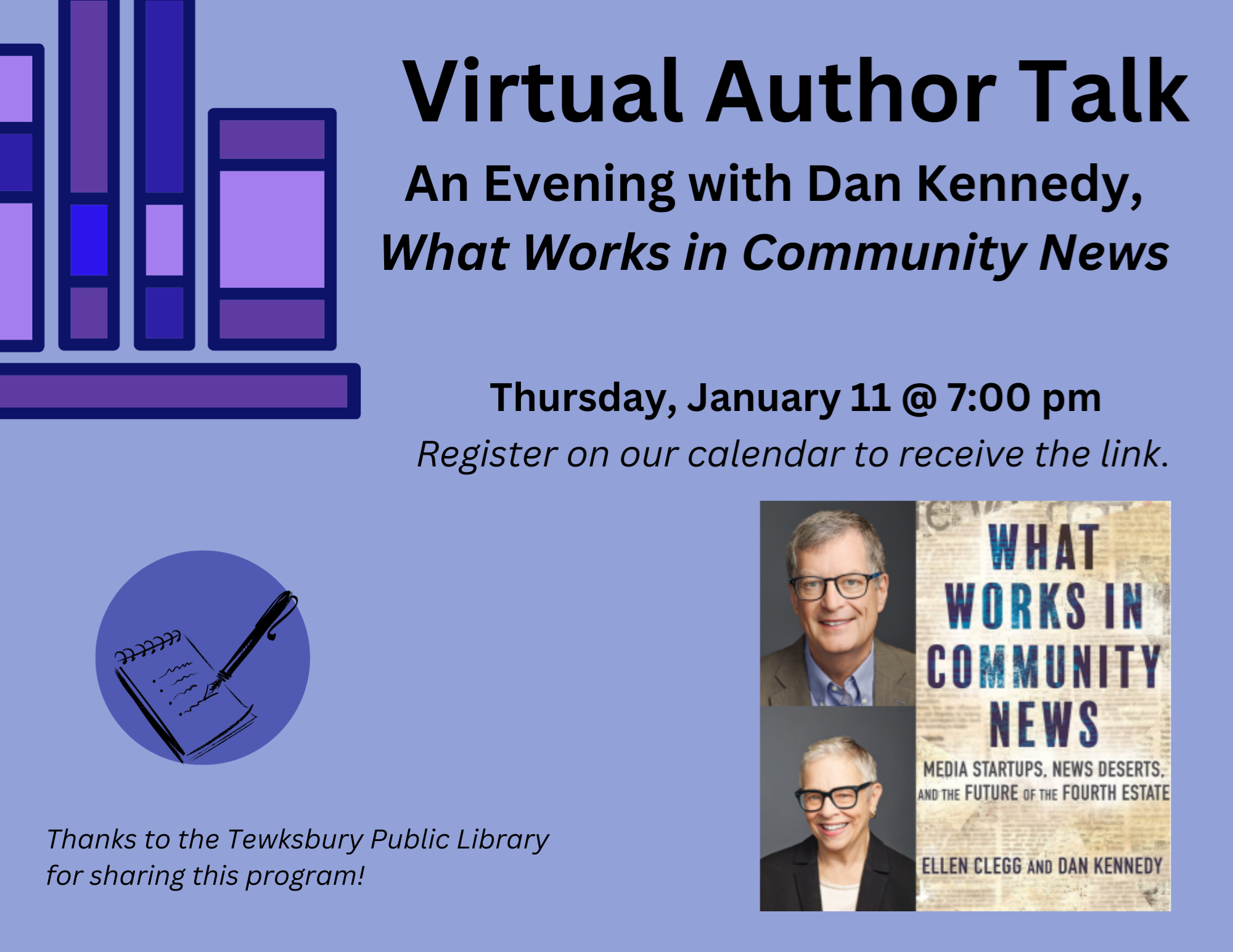 VIRTUAL: Author Talk with Dan Kennedy, What Works in Community News Thursday, January 11 @ 7:00 pm Journalism professor & author Dan Kennedy will discuss his new book, What Works in Community News: Media Startups, News Deserts, & the Future of the Fourth Estate, which serves as a groundbreaking study of the journalism startups that are solving the local news crisis one community at a time. Local news is essential to democracy. Meaningful participation in civic life is impossible without it. However, local news is in crisis. According to one widely cited study, some 2,500 newspapers have closed over the last generation. Dan Kennedy is a professor in the School of Journalism at Northeastern University and a nationally known media commentator. Learn more about Dan and Ellen's book and podcast HERE. Thanks to the Tewksbury Public Library for sharing this program!
