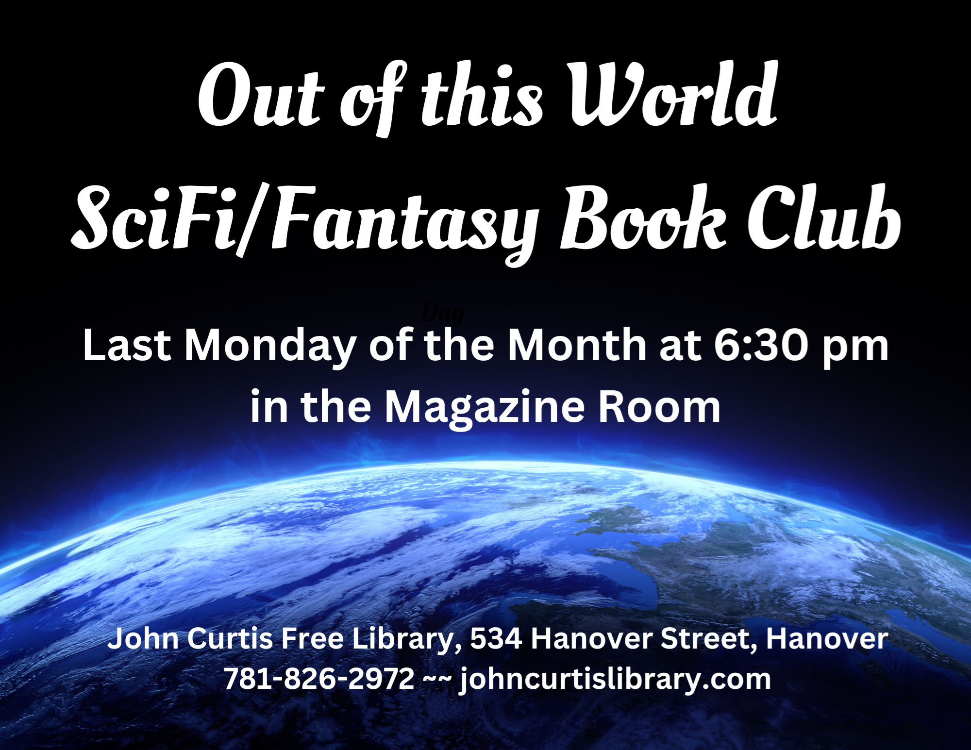 IN PERSON: Out of This World Science Fiction/Fantasy Book Club Monday, January 29 @ 6:30 pm Join us for the Out of This World Science Fiction / Fantasy Book Club! We meet on the last Monday of the month, and alternate between science fiction and fantasy titles. The title for January is Witchmark by C.L. Polk.