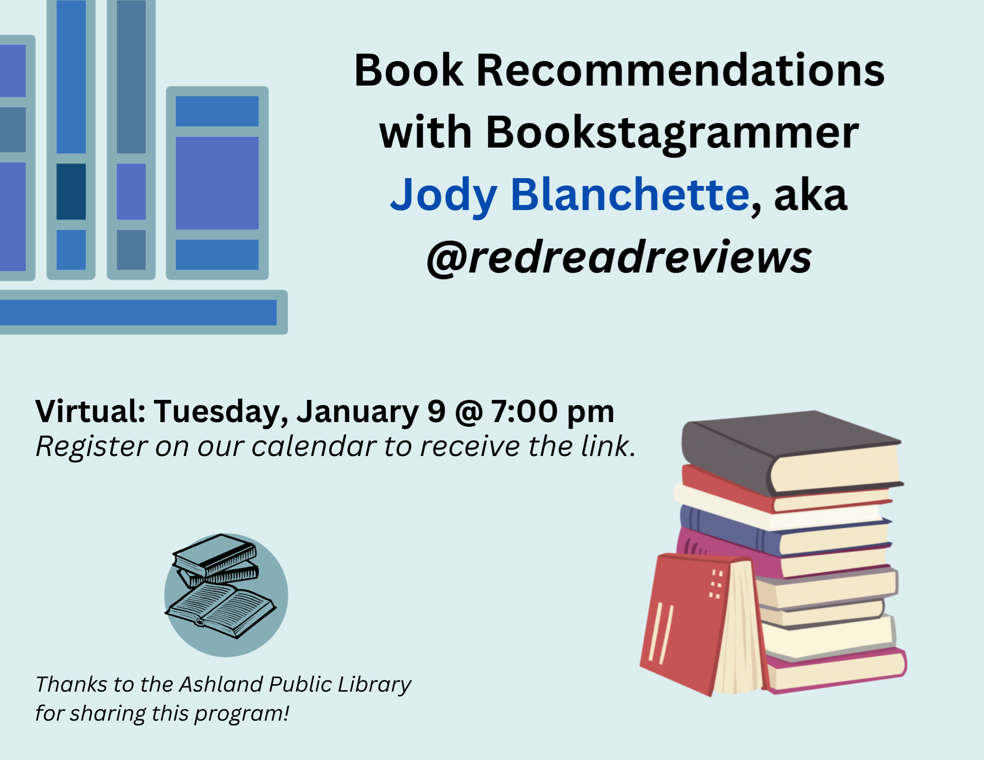 VIRTUAL: Book Recommendations with Bookstagrammer Jody Blanchette, aka @redreadreviews Tuesday, January 9 @ 7:00 pm Not sure what to read next? Join Jody for 30 minutes of pure book recommendations - every genre and interest! We're sure you'll find something to like from Jody's many enthusiastic reviews. Jody is an Instagram reviewer and Book Club leader. We can't wait to hear what she'll be recommending - be ready for your TBR pile to fall over! We'll send out a list of all recommendations for those who register. Thanks to the Ashland Public Library for sharing this program!
