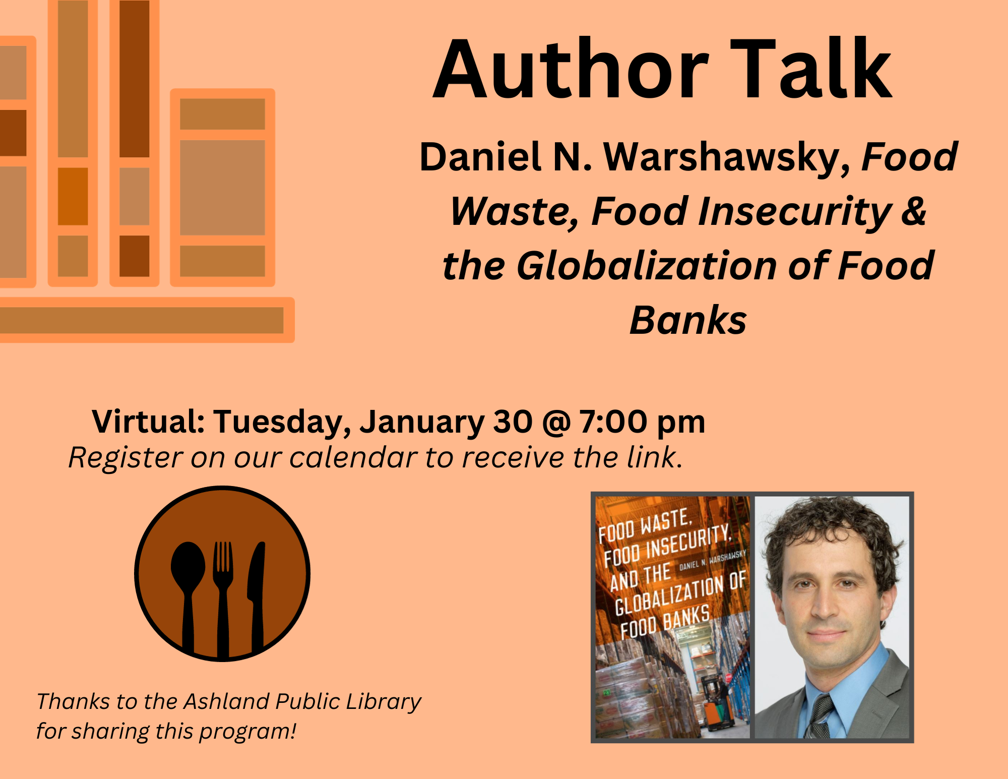 VIRTUAL: Author Talk with Daniel N. Warshawsky, Food Waste, Food Insecurity and the Globalization of Food Banks Tuesday, January 30 @ 7:00 pm So many of us are passionate about finding ways to reduce food waste so we're thrilled to be hosting author and professor Daniel N. Warshawsky for a virtual discussion of his new book "Food Waste, Food Insecurity, and the Globalization of Food Banks". Food banks—warehouses that collect and systematize surplus food—have expanded into one of the largest mechanisms to redistribute food waste. From their origins in North America in the 1960s, food banks provide food to communities in approximately one hundred countries on six continents. This book analyzes the development of food banks across the world and the limits of food charity as a means to reduce food insecurity and food waste. Daniel N. Warshawsky is an Associate Professor in the School of Social Sciences and International Studies at Wright State University where he teaches courses in geography and public administration. He is also the Director of the Master of Public Administration (MPA) program. Thanks to the Ashland Public Library for sharing this program!