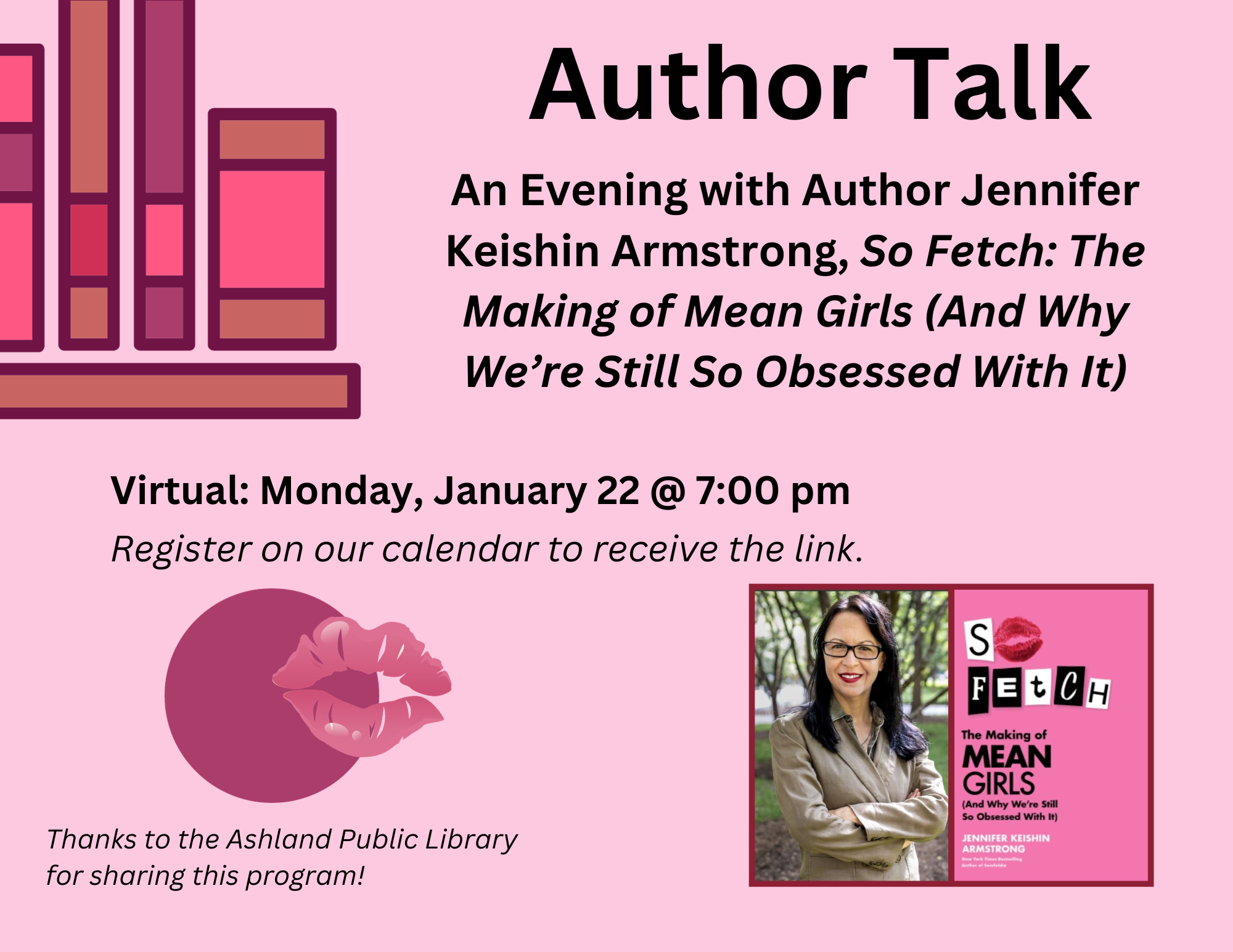 VIRTUAL: Author Talk with Jennifer Keishin Armstrong, So Fetch: The Making of 'Mean Girls' (and Why We're Still So Obsessed with It) Monday, January 22 @ 7:00 pm Jennifer's book, "So Fetch" just came out on Jan 16th and we can't wait to ask her all of the nitty gritty details of this story of one of the most iconic teen comedies of all time, Mean Girls, in which she reveals how it happened, how it defined a generation, “like, invented” meme culture, and why it just won’t go away. The book is filled with exclusive interviews from the director, cast, and crew - Lindsay Lohan, Rachel McAdams & Tina Fey (oh my!). Timed for the 20th anniversary and the release of the new movie musical adaptation, So Fetch is the perfect companion for fans and anyone who understands that when it comes to Mean Girls’ enduring legacy, the limit does not exist! About Jennifer: Jennifer Keishin Armstrong has written seven books, including the New York Times bestseller Seinfeldia; When Women Invented Television; Mary and Lou and Rhoda and Ted; and Sex and the City and Us. Formerly a staff writer at Entertainment Weekly, where she worked for a decade, her writing appears in many publications, including BBC Culture, The New York Times Book Review, Vice, New York magazine, and Billboard. Thanks to the Ashland Public Library for sharing this program!