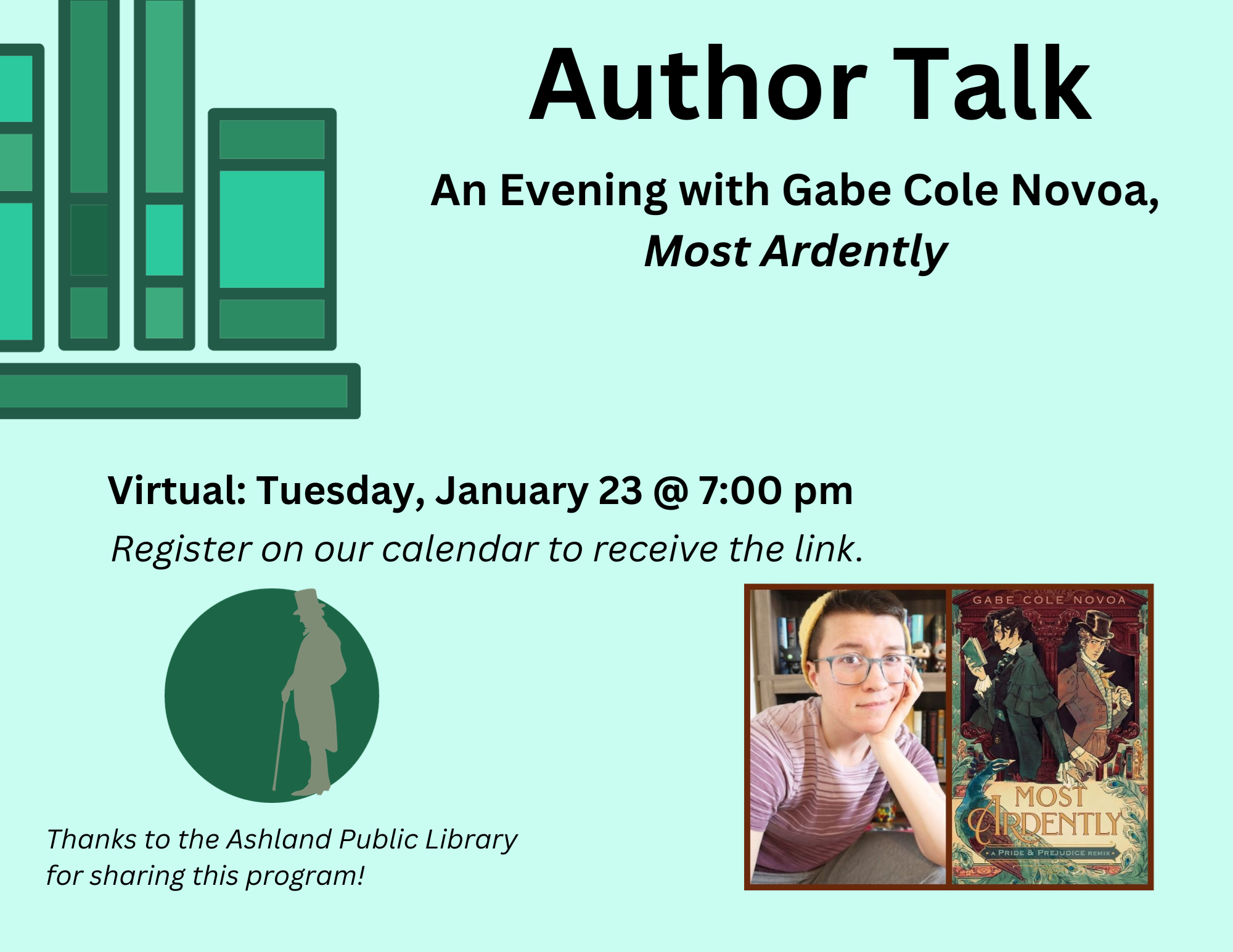 VIRTUAL: Author Talk with Gabe Cole Novoa, Most Ardently Tuesday, January 23 @ 7:00 pm We are celebrating the release of Gabe's book, "Most Ardently!" This is a "Pride and Prejudice" remix like you've never seen! We hope you can join us for what will be a fascinating and fun evening. About the book: London, 1812. Oliver Bennet feels trapped. Not just by the endless corsets, petticoats and skirts he's forced to wear on a daily basis, but also by society's expectations. The world - and the vast majority of his family and friends - think Oliver is a girl named Elizabeth. He is therefore expected to mingle at balls wearing a pretty dress, entertain suitors regardless of his interest in them, and ultimately become someone's wife. As Oliver is able to spend more time as his true self, often with Darcy, part of him dares begin to hope that his dream of love and life as a man to be possible. But suitors are growing bolder - and even threatening - and his mother is growing more desperate to see him settled into an engagement. Oliver will have to choose: Settle for safety, security, and a life of pretending to be something he's not, or risk it all for a slim chance at freedom, love, and a life that can be truly, honestly his own. About Gabe: Gabe Cole Novoa (he/him) is a Latinx transmasculine author who writes speculative fiction featuring marginalized characters grappling with identity. Gabe is the author of The Wicked Bargain, Most Ardently: A Pride & Prejudice Retelling (out January 16, 2024), The Diablo's Curse (out February 20, 2024), and the Beyond the Red trilogy, written under a former pseudonym. You can find him across a variety of social media sites at @thegabecole. Thanks to the Ashland Public Library for sharing this program!