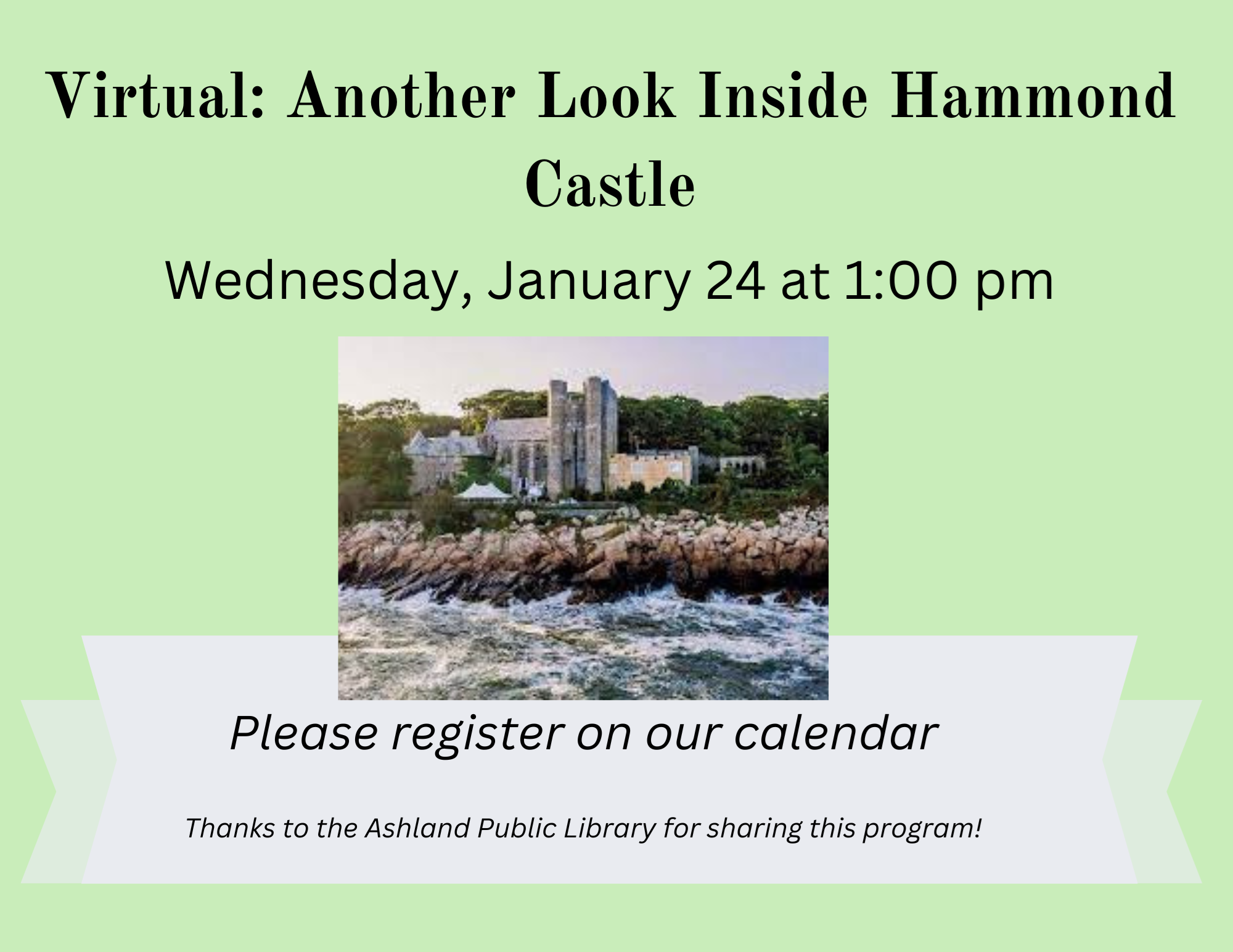 VIRTUAL: Another Look Inside Hammond Castle Wednesday, January 24 @ 1:00 pm We learned so much from John Leysath, curator at Hammond Castle Museum, back in October, we just had to have him back! This time he'll be digging even deeper into the life and inventions of the original owner, creator of the castle, and noted scientist John Hays Hammond Jr. Mr. Hammond was one of the most prolific inventors in U.S. history, and registered over 500 patents throughout his career. Known as "the father of radio control," Hammond was a pioneer in many technologies, including television and sound recording. He counted among his friends and mentors Thomas Edison, Nikola Tesla, and Alexander Graham Bell. He was also a collector of ancient, medieval, and Renaissance artifacts, and built his castle-like home in Gloucester, Massachusetts in the late 1920s. John Leysath is the curatorial director at Hammond Castle Museum, a position he has held since 2021. He specializes in exploring the history of Hammond's scientific career, and communicating the importance of his groundbreaking work to the Museum's many visitors. He is also responsible for the Museum's exhibits and digital media. Thanks to the Ashland Public Library for sharing this program!