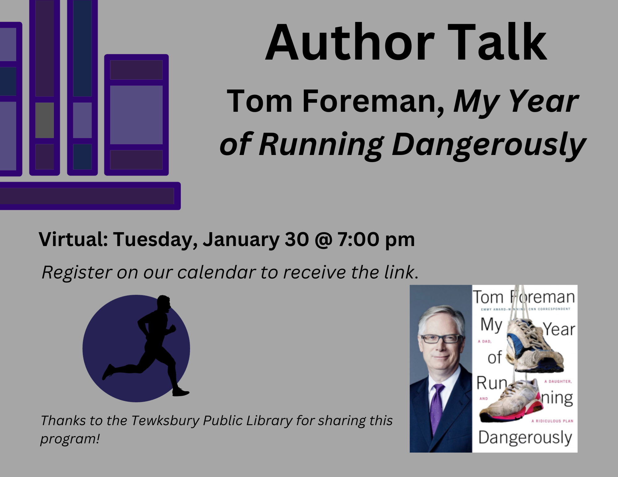 VIRTUAL: Author Talk with Tom Foreman, My Year of Running Dangerously Tuesday, January 30 @ 7:00 pm CNN correspondent & veteran journalist Tom Foreman will discuss his book, My Year of Running Dangerously: A Dad, a Daughter, and a Ridiculous Plan, in conversation with author Dale Phillips, who facilitates the Tewksbury Library's Writers Group. Foreman's book shares his remarkable journey from half-hearted couch potato to ultra-marathon runner, with four half-marathons, three marathons, and 2,000 miles of training in between. It is a poignant and warm-hearted tale of parenting, overcoming the challenges of age, and quiet triumph. Thanks to the Tewksbury Public Library for sharing this program!