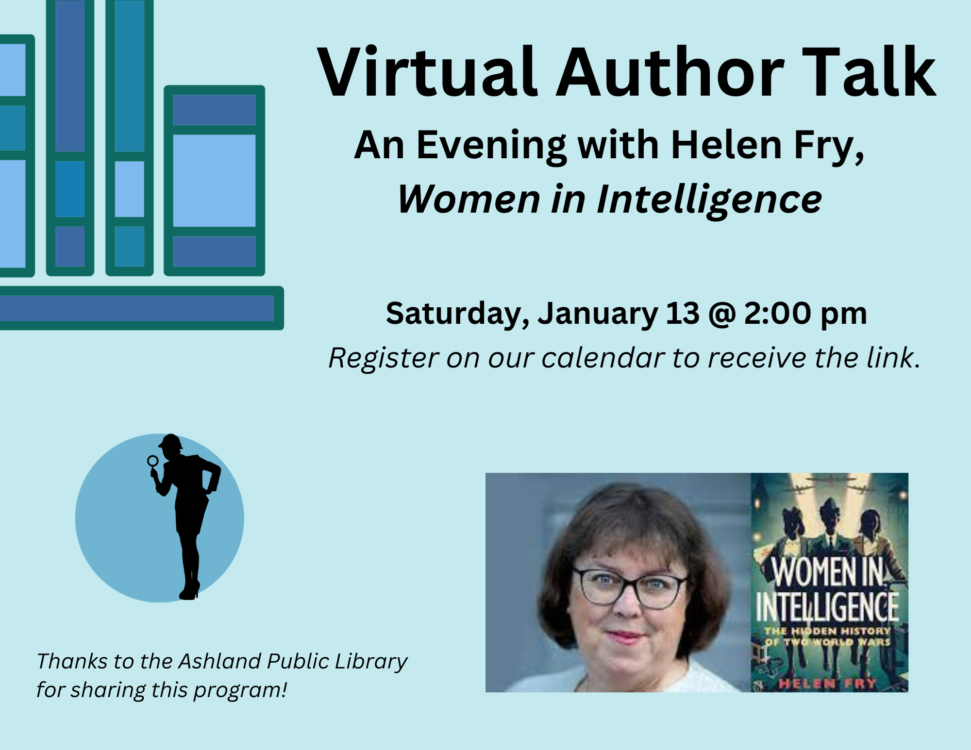 VIRTUAL: Author Talk with Helen Fry, Women in Intelligence Saturday, January 13 @ 2:00 pm If you are fascinated by the untold stories of women's contributions to war efforts, please join author and historian, Helen Fry, as she discusses her latest book "Women in Intelligence: The Hidden History of Two World Wars". It is a ground-breaking history of women in British intelligence, revealing their pivotal role across the first half of the twentieth century. About Helen: Dr. Helen Fry is a distinguished WWII historian and author with a profound focus on the contributions of 10,000 Germans and Austrians who fought for Britain during WWII. Her specialization extends to the intriguing realm of the 'Secret Listeners' and the intricate world of 20th-century spies and espionage. Thanks to the Ashland Public Library for sharing this program!