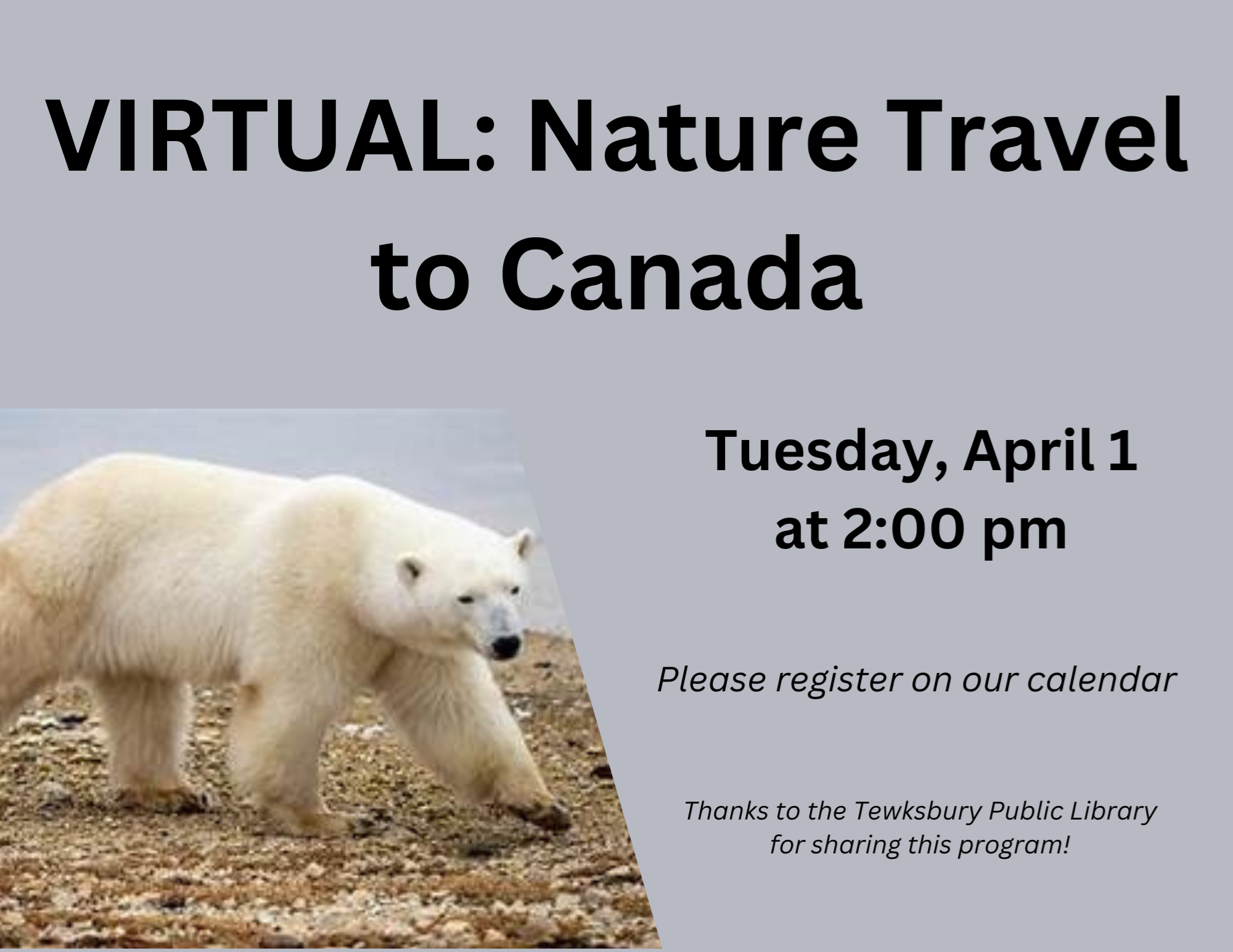 VIRTUAL: Nature Travel to Canada Tuesday, April 1 at 2:00 pm Bill Gette has led five organized natural history travel adventures to Manitoba, Canada. His itineraries included visits to beautiful areas in the southern part of the province and to the province’s far northern port of Churchill. During this trip, he and his participants visited the Oak Hammock Marsh located a short distance north of Winnipeg; the small village of Pinawa near the Ontario border; the Delta Beach area on Lake Manitoba; and Riding Mountain National Park. In Churchill, located on Hudson Bay, Bill explored the vast tundra looking for nesting birds and other wildlife. Bill will share his photographs of nesting songbirds (Yellow-headed Blackbird, Black-and-white Warbler, Red-eyed Vireo, Sedge Wren); shorebirds (Upland Sandpiper, Wilson’s Snipe, Red-necked Phalarope, Short-billed Dowitcher, Hudsonian Godwit); mammals (Red Fox, Black Bear, Beluga Whale); and beautiful wildflowers. Gette, who has been leading travel programs for Mass Audubon since 1986, is the retired Director of the Audubon's Joppa Flats Education Center in Newburyport. Thanks to the Tewksbury Public Library for sharing this program!