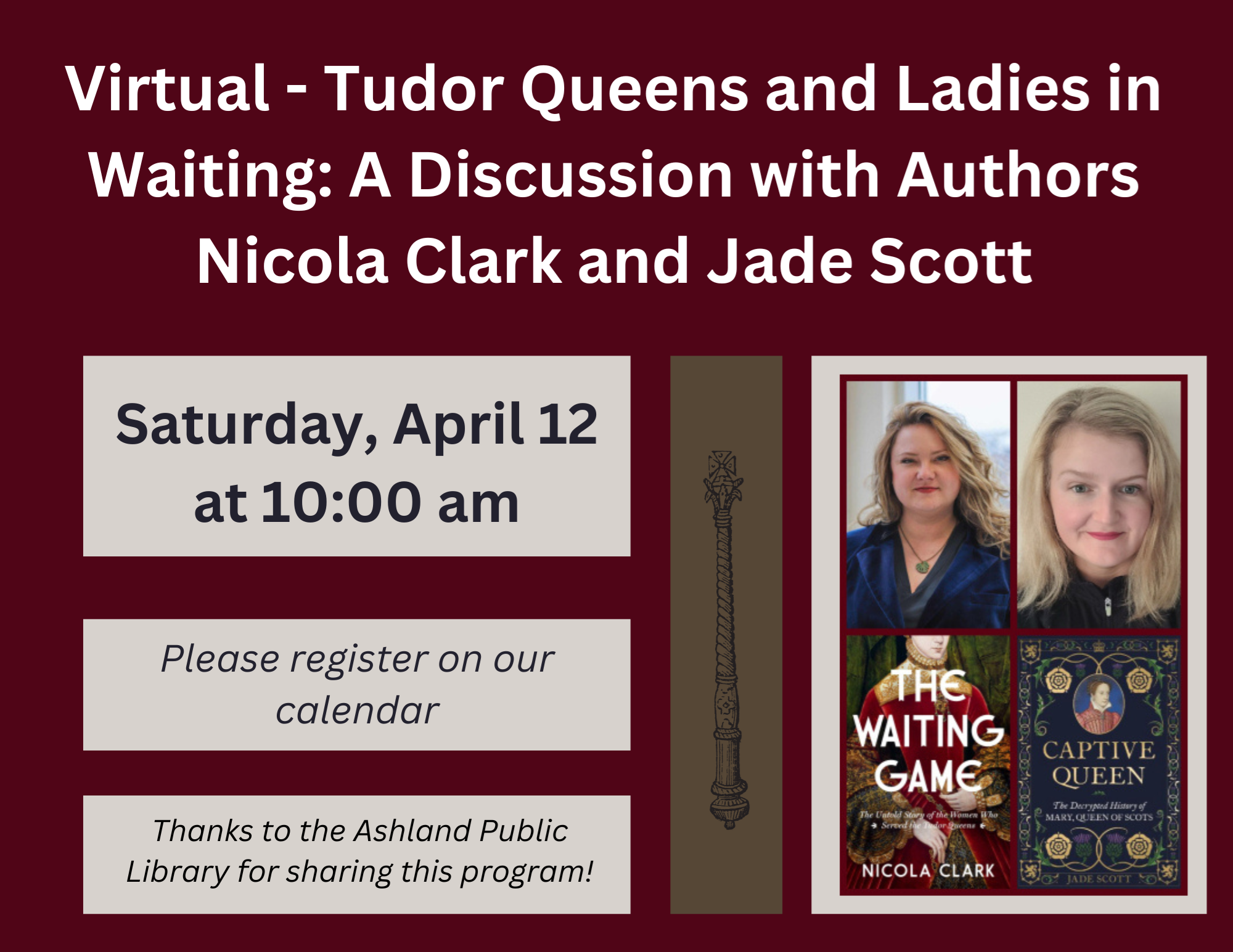 VIRTUAL: Tudor Queens and Ladies in Waiting: A Discussion with Authors Nicola Clark and Jade Scott Saturday, April 12 at 10:00 am We are so excited to welcome authors Nicola Clark and Jade Scott to our virtual stage to discuss one of our favorite topics - the Tudor Queens and their Ladies in Waiting! Nicola's book, "The Waiting Game: The Untold Story of the Women Who Served the Tudor Queens" and Jade's book, "Captive Queen: The Decrypted History of Mary, Queen of Scots" delve into the true lives of these historic women, digging into their lives in those times and the challenges of being in the Tudor monarchy. Learn more about the authors on our calendar! Thanks to the Ashland Public Library for sharing this program!