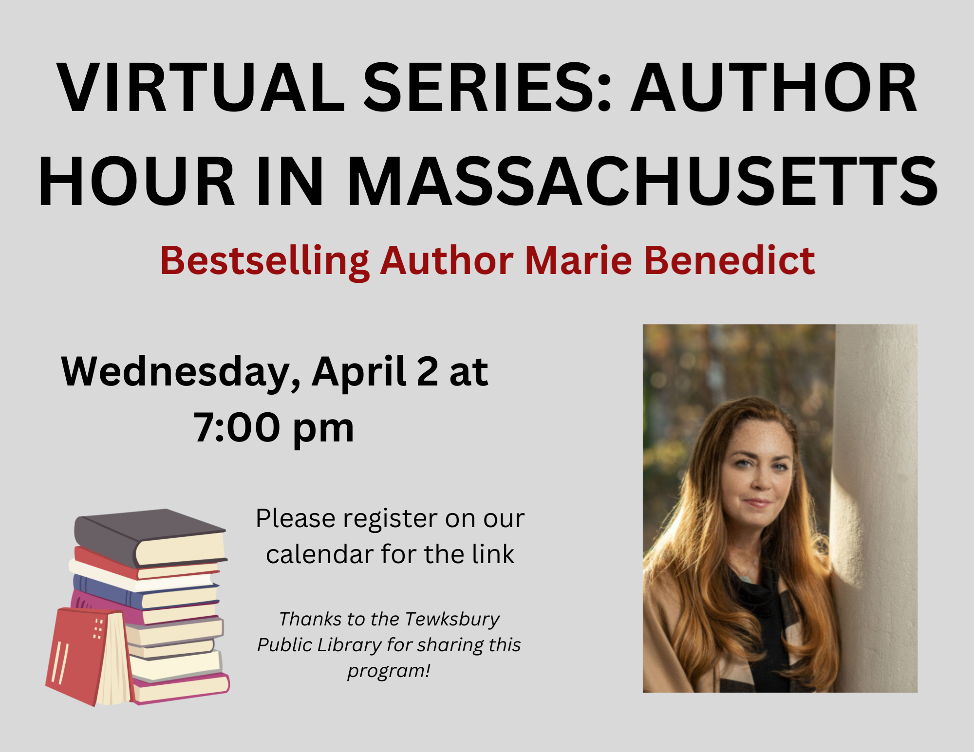 VIRTUAL: AUTHOR HOUR IN MASSACHUSETTS: Bestselling Author Marie Benedict Wednesday, April 2 at 7:00 pm Bestselling author Marie Benedict will discuss her new historical fiction mystery, The Queens of Crime, in this installment of "Author Hour in Massachusetts." Marie Benedict is the New York Times and USA Today bestselling author of The Queens of Crime, The Mitford Affair, Her Hidden Genius, The Mystery of Mrs. Christie, The Only Woman in the Room, Lady Clementine, Carnegie's Maid, The Other Einstein, and with Victoria Christopher Murray, the Good Morning America Book Club pick The Personal Librarian and the Target Book of the Year The First Ladies. She lives in Pittsburgh with her family. About Author Hour in Massachusetts: "Author Hour in Massachusetts" is a series of virtual author talks this spring featuring some of the publishing industry's top trending writers. These webinars -- held from 7pm (ET) to 8pm (ET), Monday through Thursday -- are free and open to all. This series, which runs through June 20, 2025, is being promoted by more than 50 public libraries in Massachusetts. Thanks to the Tewksbury Public Library for sharing this program!