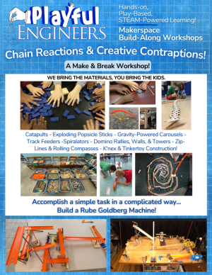 Chain Reactions with Playful Engineers (ages 5 years old and up) Wednesday, July 30 at 1:00 pm In this hands-on, STEM focused workshop, participants design, build, test, and play with chain reactions and creative contraptions, like Rube Goldberg Machines, paper constructions, domino towers, exploding popsicle-stick snakes, and other awesome engineering explorations. For age five years and older.