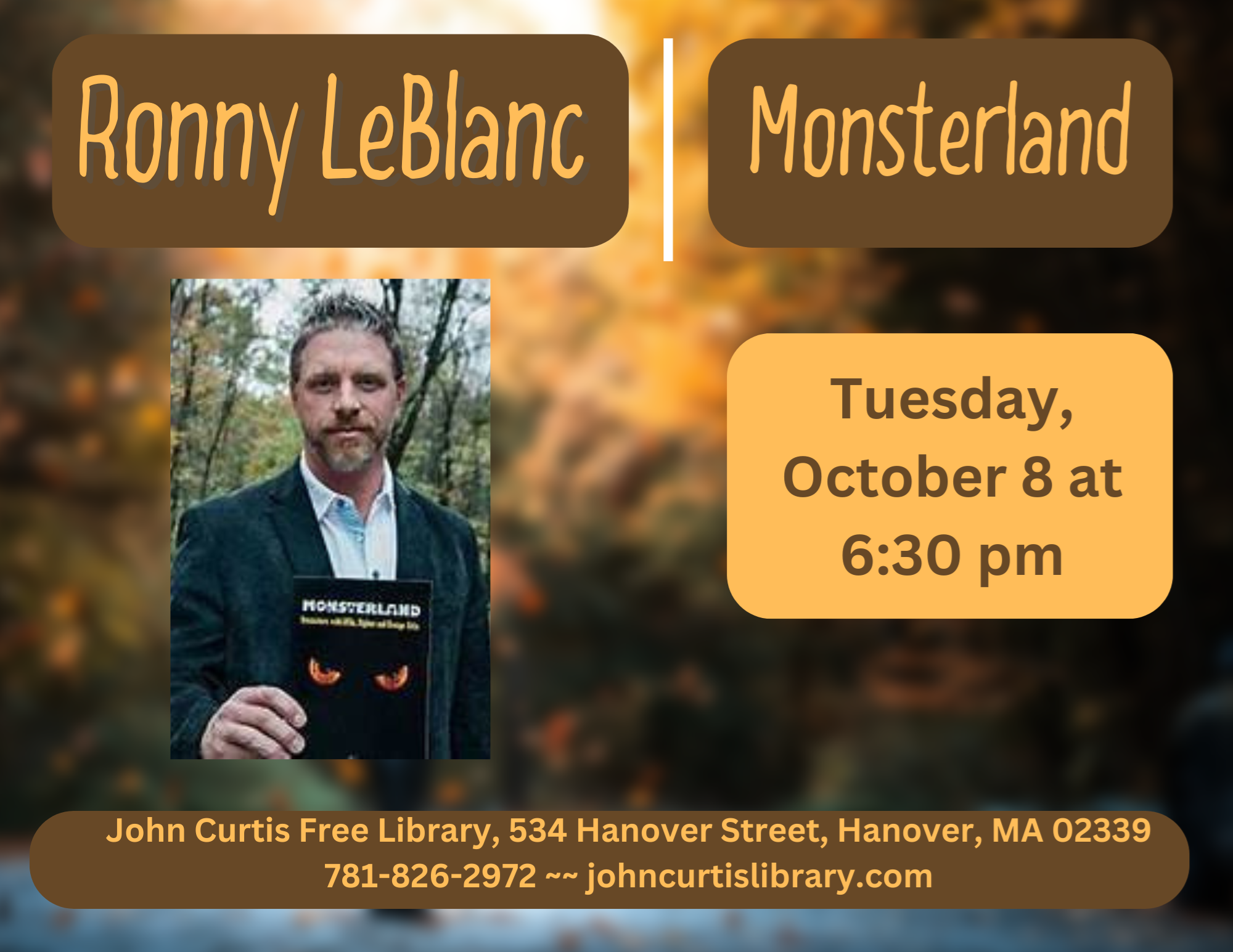 Author Talk: Ronny LeBlanc Tuesday, October 8 at 6:30 pm Ronny LeBlanc stars in EXPEDITION BIGFOOT (Travel Channel & Discovery+/Warner Bros Discovery). He is the author of Monsterland: Encounters with UFOs, Bigfoot & Orange Orbs and the follow up book, Monsterland: Shamans, Sasquatch, Synchronicity & High Strangeness. Learn about the history of UFO sightings in Massachusetts as well as Bigfoot encounters that continue to this day in and around Leominster State Forest.