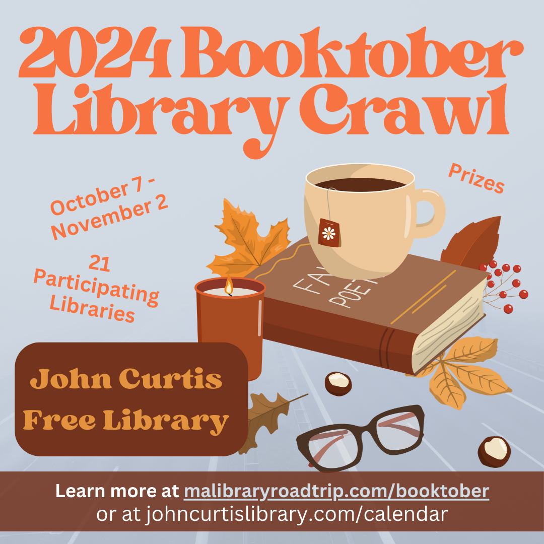 Have you heard? We're is participating in the 2024 Booktober Library Crawl! The Booktober Library Crawl is a collaborative program between 21 OCLN Libraries beginning Monday, October 7 through Saturday, November 2. Pick up your Booktober Library Crawl Passport and visit at least five libraries to be eligible to win a prize basket! For a complete list of participating libraries, visit https://malibraryroadtrip.com/ocln/booktober.
