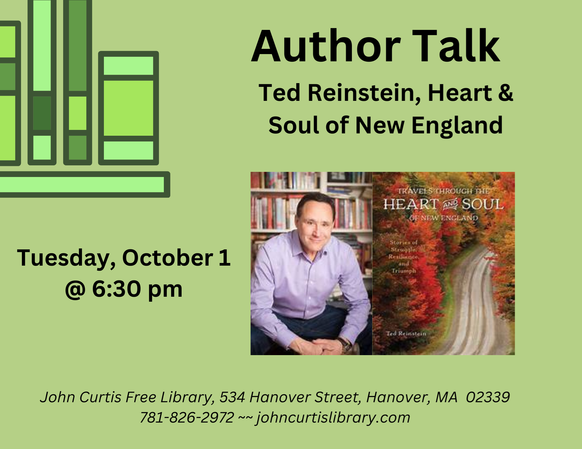 Author Talk: Ted Reinstein Tuesday, October 1 at 6:30 pm Journalist and author Ted Reinstein has reported all around New England for 25 years, telling the colorful stories of this historic yet ever-changing corner of America. Now, he condenses his countless travels into a single, unique labor of love: a journey through the heart and soul of New England, meeting the most memorable people—and their unlikely stories—all along the way. People whose struggles, toughness, triumphs, and humor not only define the very essence of New England, but represent the timeless best of America as well.