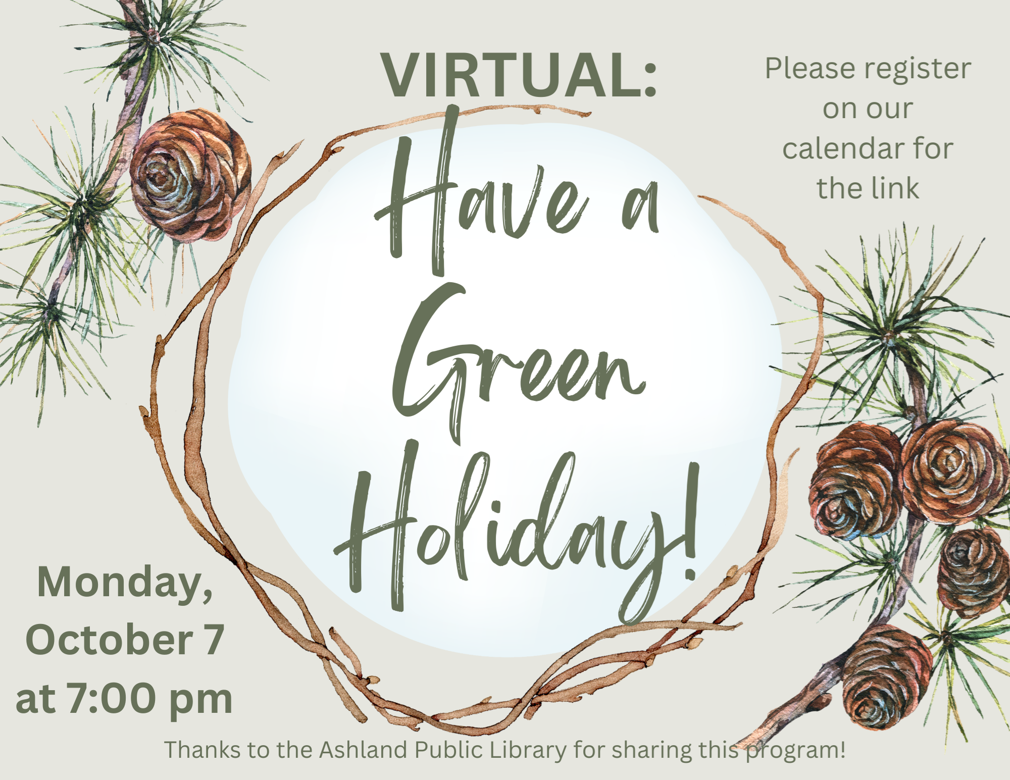 VIRTUAL: How to Have a Green Holiday Season Monday, October 7 at 7:00 pm Rather than getting carried away by the holiday rush, use this time as an opportunity to create the kind of holiday season you truly want - one focused on the magic of family and togetherness instead of stuff. A low-waste holiday season is possible. Whether you have kids of your own, kids in your life, or love being a kid yourself during the holidays, Sarah has some suggestions for how to lower your ecological footprint this year. Sarah Robertson-Barnes is a freelance writer, educator, and consultant. She lives with her husband, two kids, and rescue dog outside of Toronto, Ontario. Sustainable in the Suburbs is a resource for living low waste with kids in a culture of convenience. A Note from Sarah: A sustainable lifestyle with kids is not only possible, but critically important for our future and theirs. Thanks to the Ashland Public Library for sharing this program!